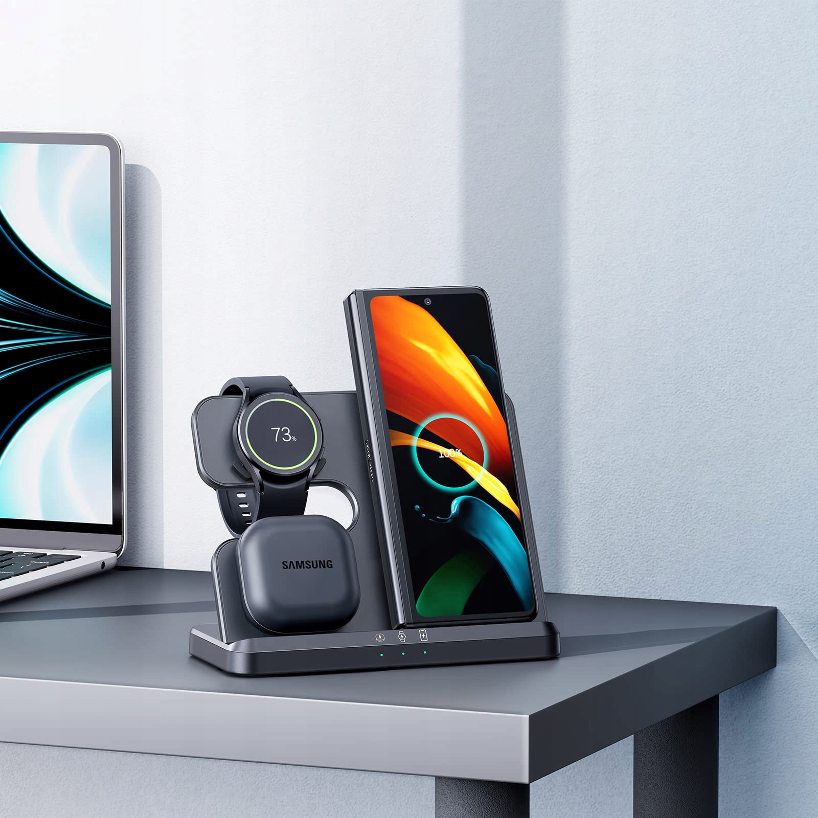 📲Широка сумісність - бездротовий зарядний пристрій 3 в 1, особливо сумісний із мобільними телефонами Samsung, годинниками та годинниками одночасно. Сумісний із Samsung Galaxy S22, S22, S22 Ultra, S21, S21, S21 fe, S21 Ultra, S20, S20, S20 Ultra, S20 FE, S10/S9/S8/S7/S6; Galaxy Z Flip, Flip 3, Flip 4; Fold2; Fold3; Galaxy Note 20, 10, 10e, 10, 9, 8, 7, 5; сумісний із Samsung Galaxy Watch 5 Pro /5 /4 Classic/Galaxy Watch 4/3/Active2/Buds/Buds /Pro/Live/2; (Примітка: не підходить для Galaxy Watch 5/5 Pro)