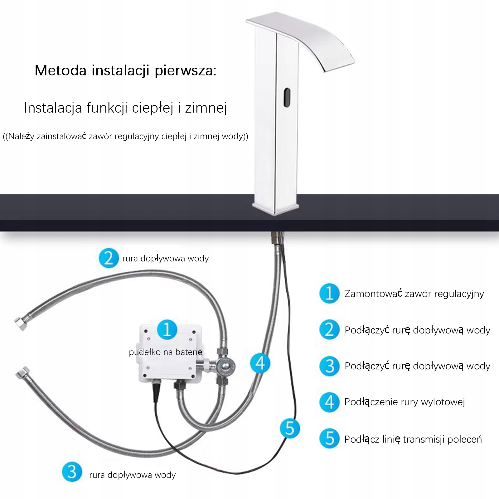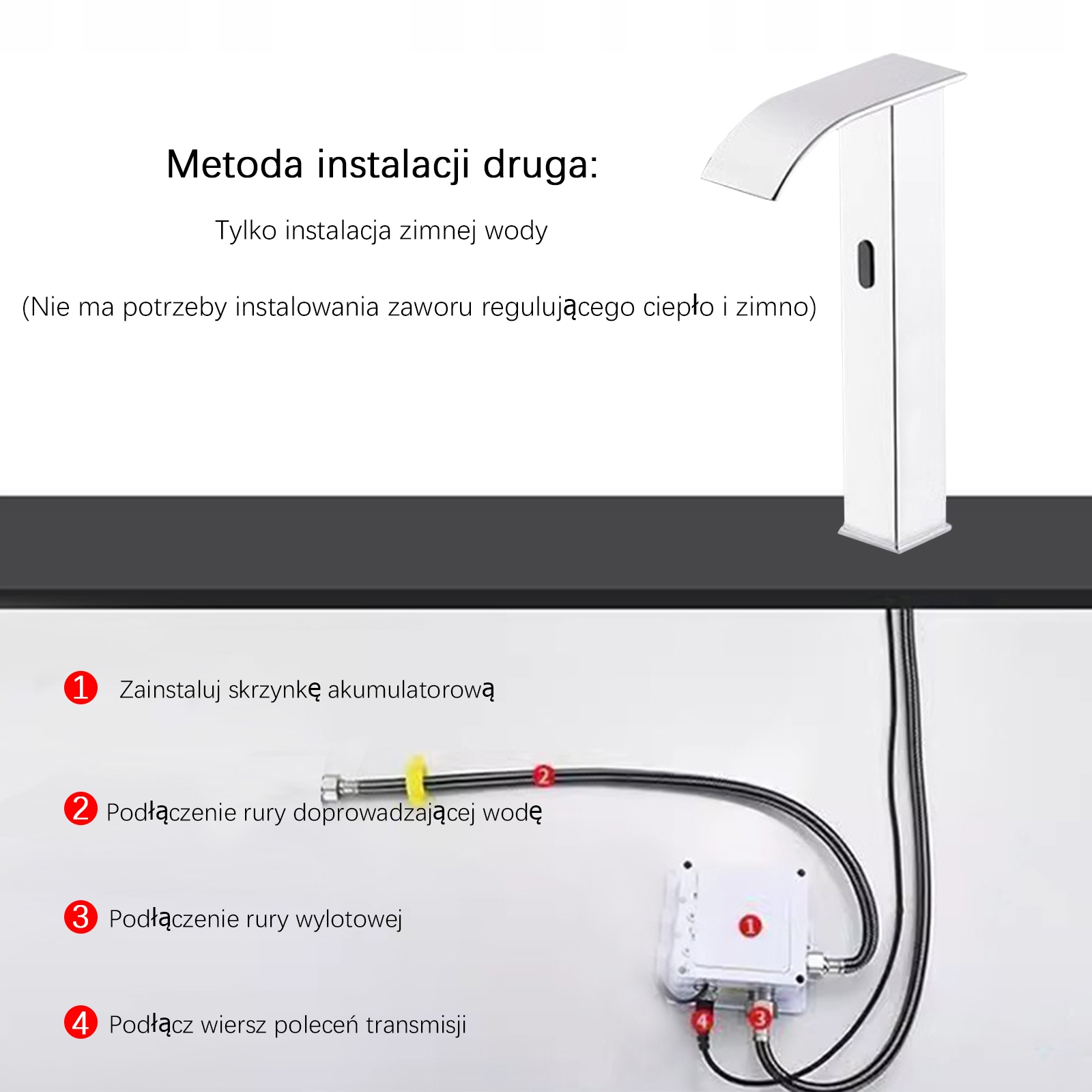 - Сенсорний, стоячий, одиночний важель з фіксованим носком з ефектом водоспаду, оснащений датчиками, які дозволяють контролювати неконтактний контроль води. Матеріал, що використовується для виробництва, - латунь. Набір включає високоякісні шланги та набір монтажних аксесуарів. Сам стиль акумулятора був пристосований до поточних тенденцій - він акуратний і елегантний. Щоб уповільнити потік води, принесіть руку до датчика, видимого на передній частині крана. Потік зупиниться автоматично після натискання руки з крана.
