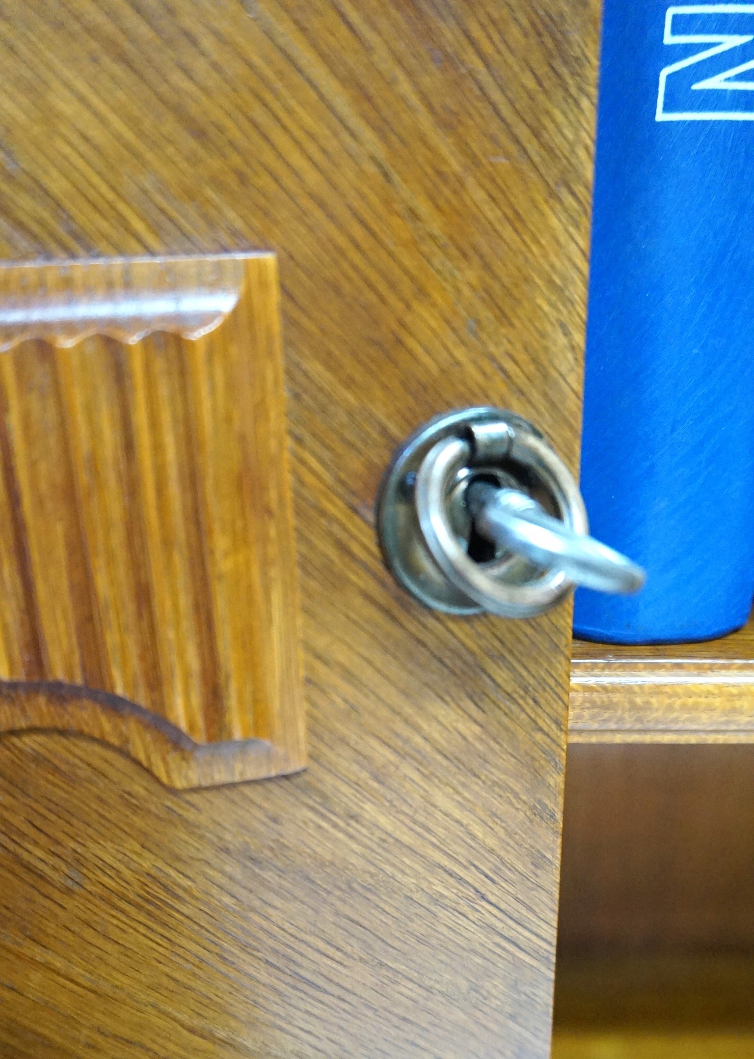 Бібліотека складається з великої книжкової шафи з полицями для книг і двох закритих стійок на сторони