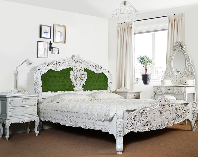 Меблі виготовлені з відібраної твердої деревини з червоного дерева найвищої якості, пофарбованої білою фарбою. Ця модель характеризується ретельною, інтенсивною різьбою, зробленою з максимальною увагою до деталей найкращих майстрів.