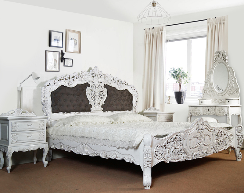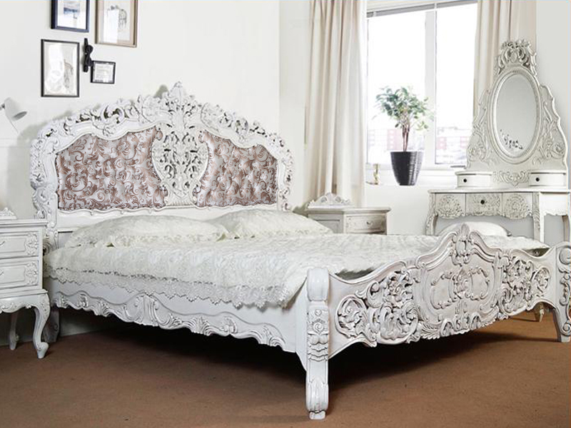 Меблі виготовлені з добірного масиву червоного дерева найвищої якості, пофарбовані білою фарбою. Ця модель характеризується ретельною, трудомісткою різьбою, виконаною з максимальною увагою до деталей найкращими майстрами.