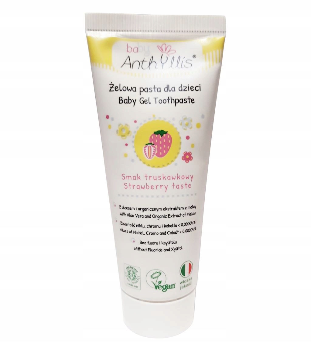 зубна паста для дітей з першого зуба! Це допомагає підтримувати належну гігієну ротової порожнини та захищає від карієсу. Він має приємний, полуничний смак, який ще більше спонукає дітей мити зуби. Завдяки низькому стирання, він ідеально підходить для догляду за зубами дитячих молока до першого року.