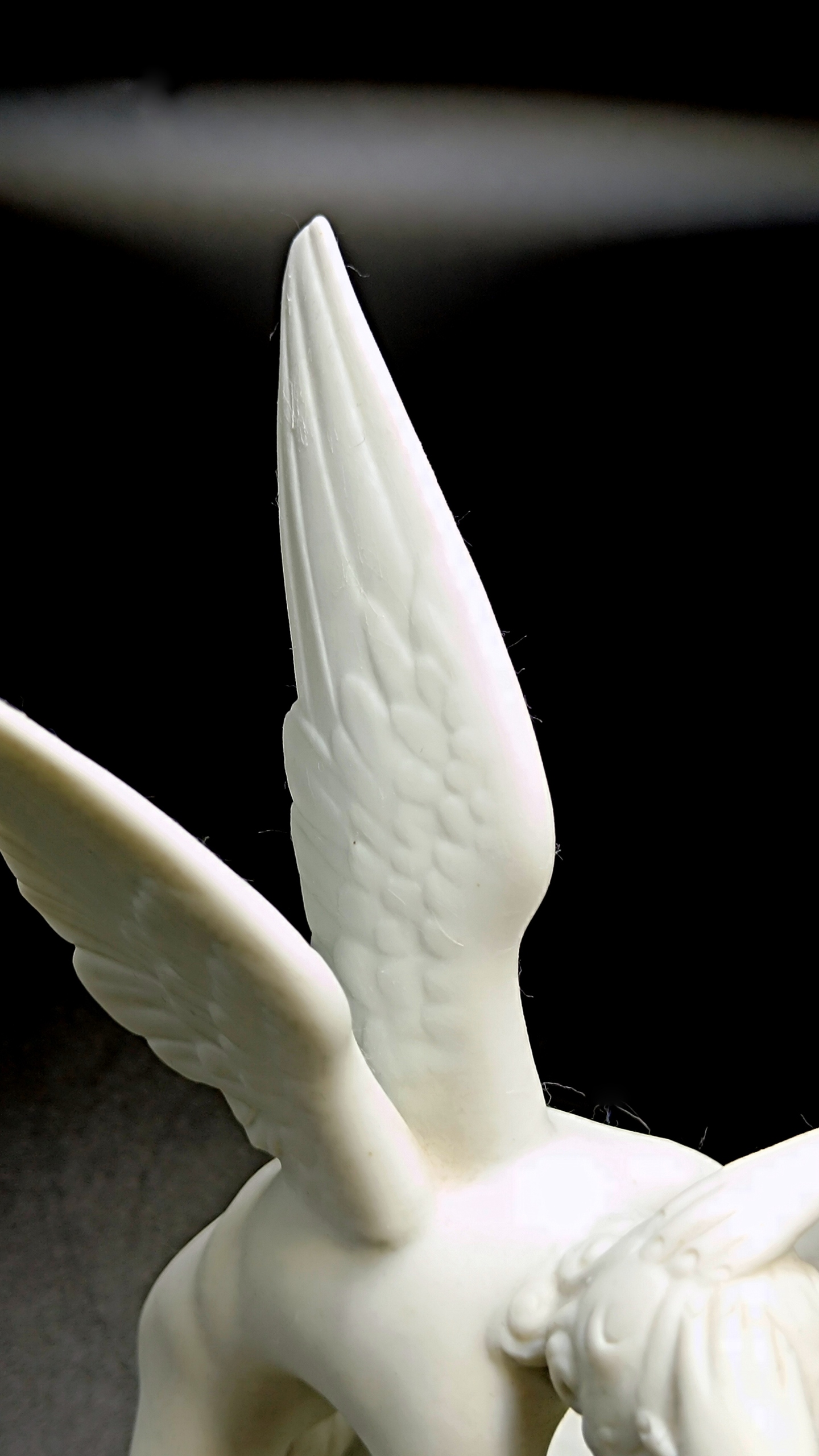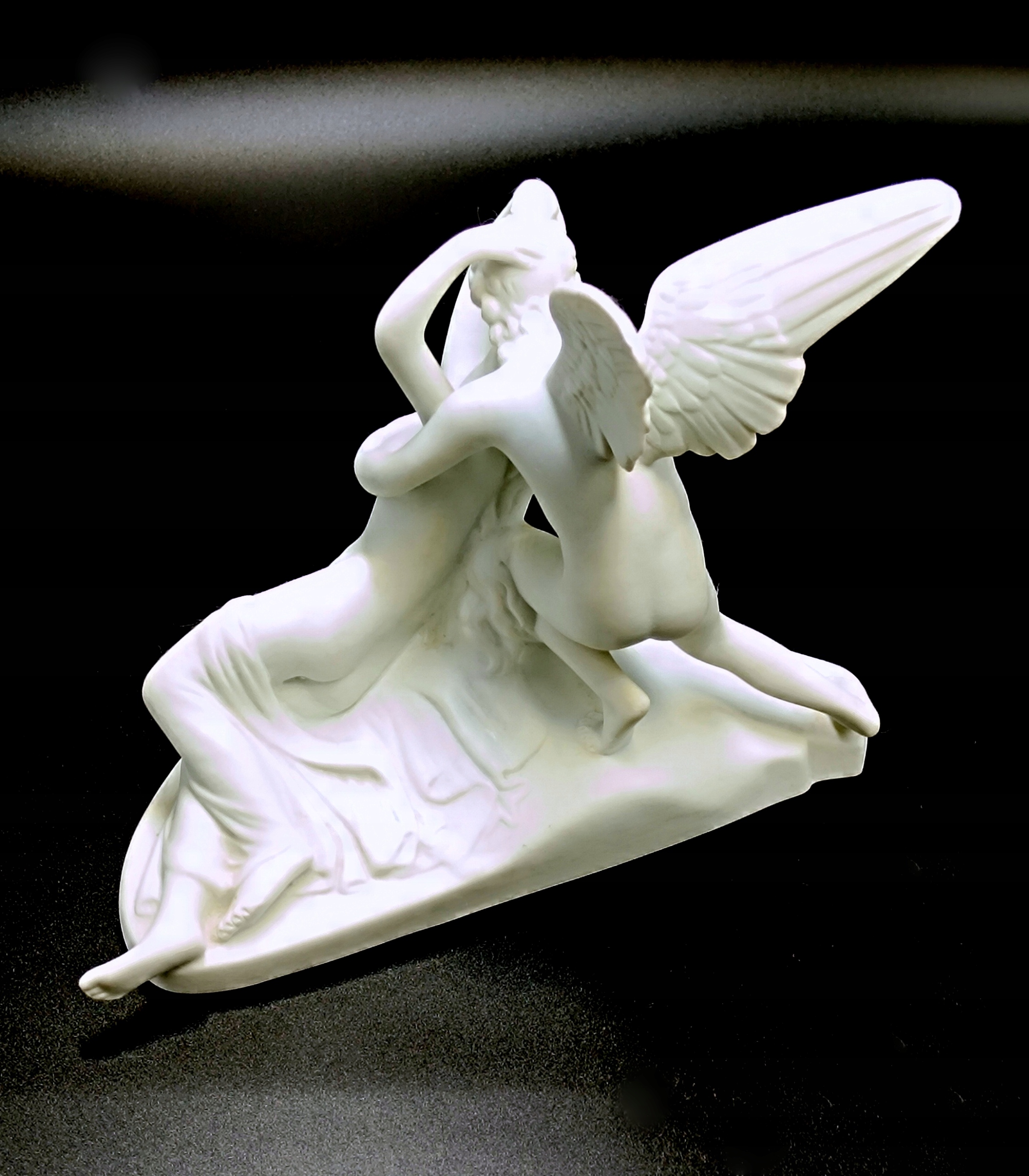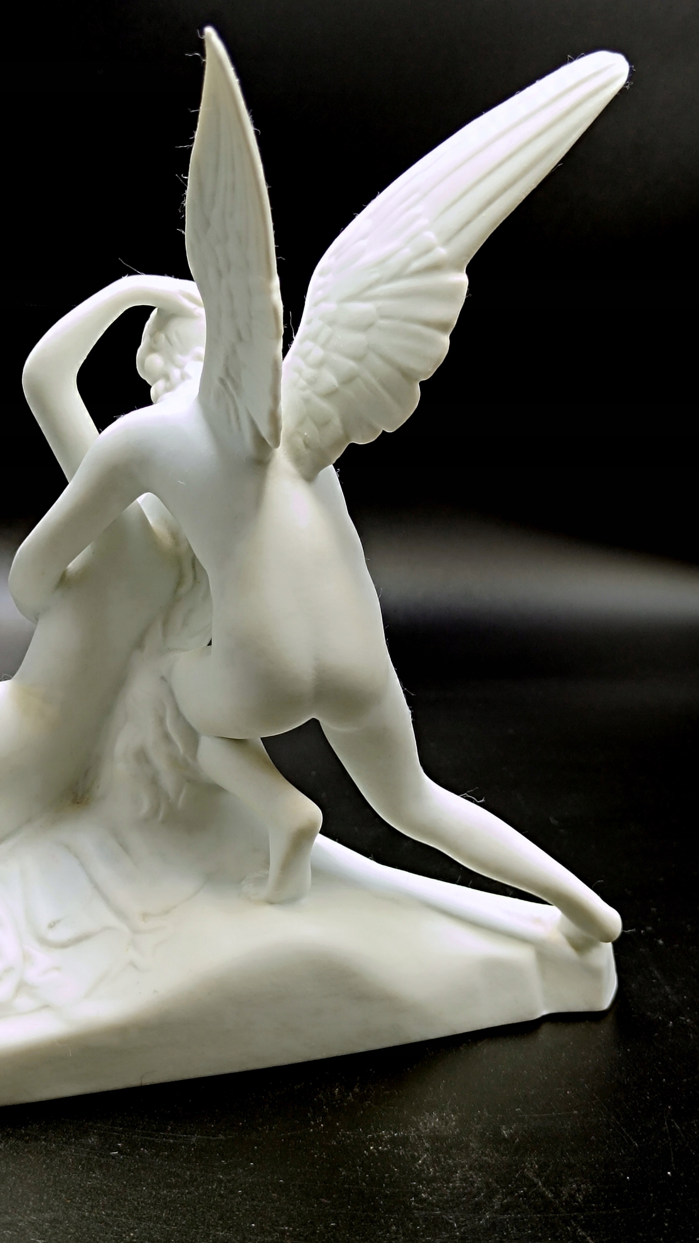 Фігурка виготовлена з високоякісної білої неглазурованої порцеляни і зображує сцену КУПІДОН І ПСИХЕЯ (Психея прокинулася від поцілунку Купідона). Вона була вперше виконана в 1787 році і є прикладом класичного способу подання одержимості та емоцій. Його навіть виставляли в паризькому Луврі. Психея в грецькій міфології — богиня, уособлення людської душі, зображена у вигляді молодої дівчини з крилами. Знизу фігурка підписана.