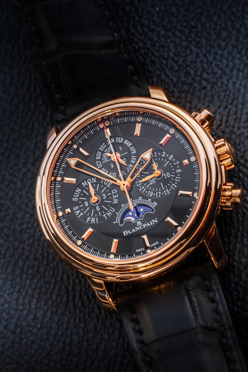 чорний. Підписано фірмовою назвою «Blancpain», з індексами та стрілками, додатковими циферблатами хронографа, вічним календарем, фазами місяця.