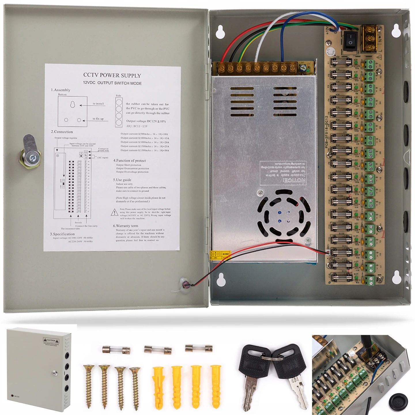 БЛОК ЖИВЛЕННЯ ДЛЯ КАМЕР СПОСТЕРЕЖЕННЯ 12В 30А 18 КАМЕР