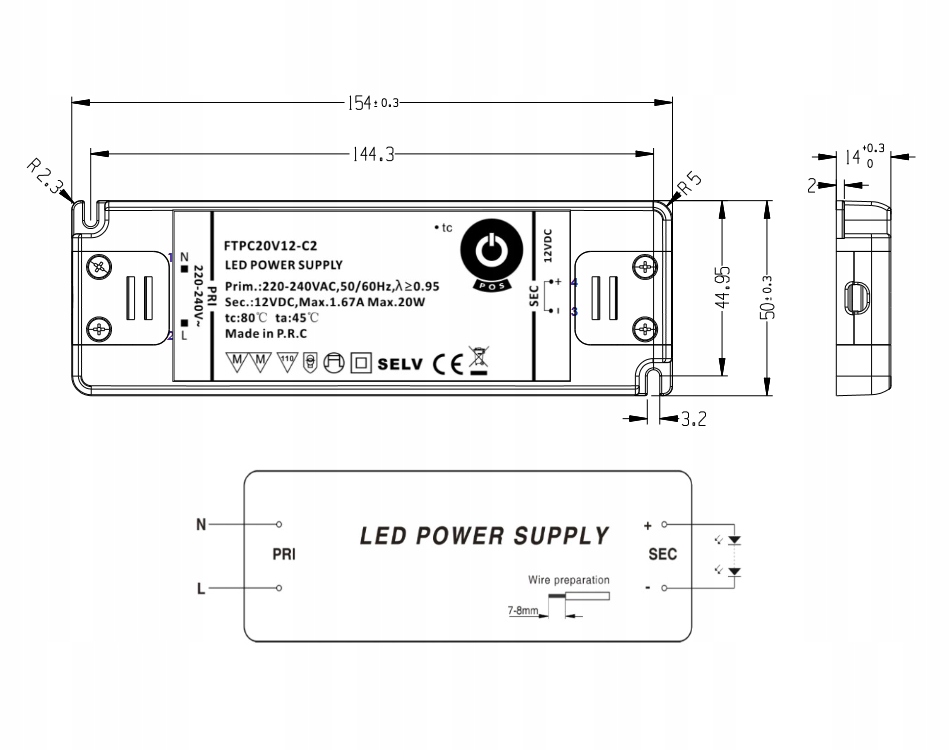 БЛОК ЖИВЛЕННЯ ДЛЯ LED POS POWER FTPC20V12-C2 20W 12V DC