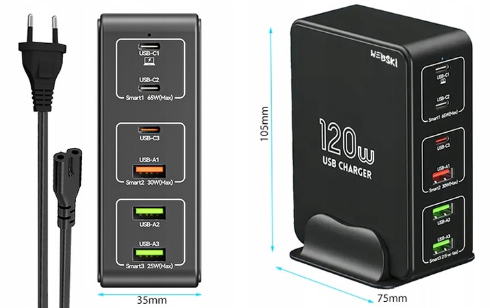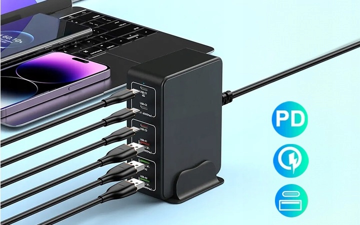 БЛОК ЖИВЛЕННЯ ШВИДКИЙ ЗАРЯДНИЙ ПРИСТРІЙ ЗАРЯДНА СТАНЦІЯ 6xUSB ПОРТ 120W 3xUSB-C PD 3xUSB