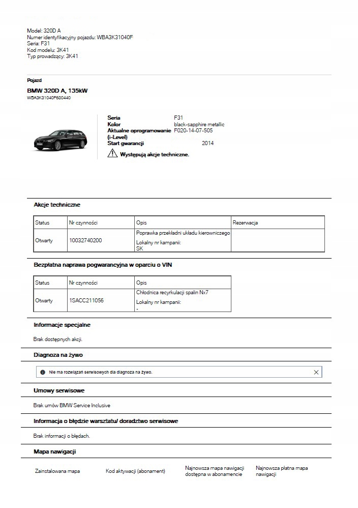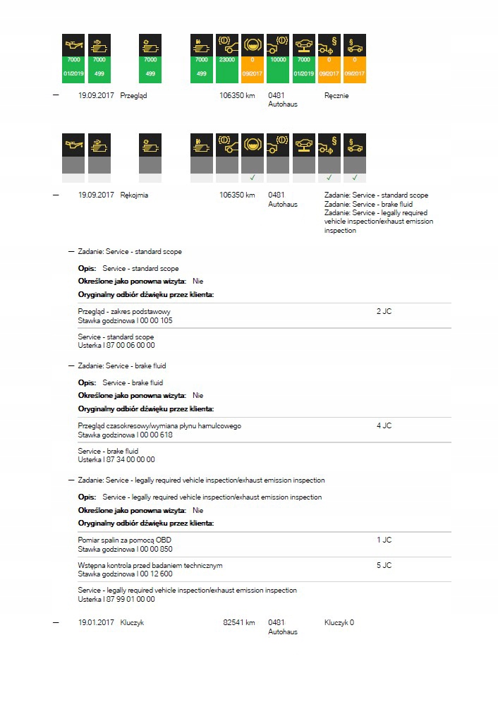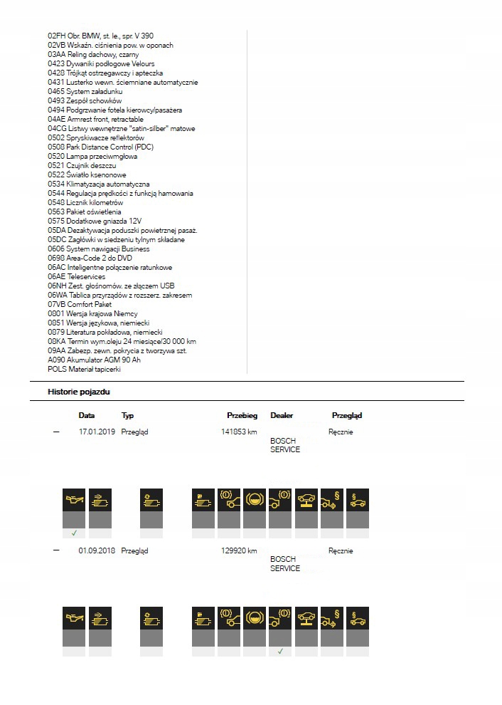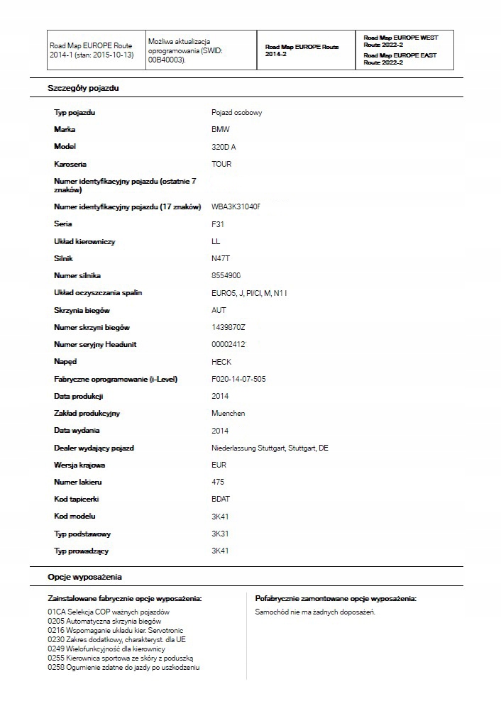 - Vehicle details (date of production, date of the beginning of the warranty, accurate Походження транспортного засобу: видача дилера, коду двигуна та живлення, коду та типу коробки передач, код лаку ...),