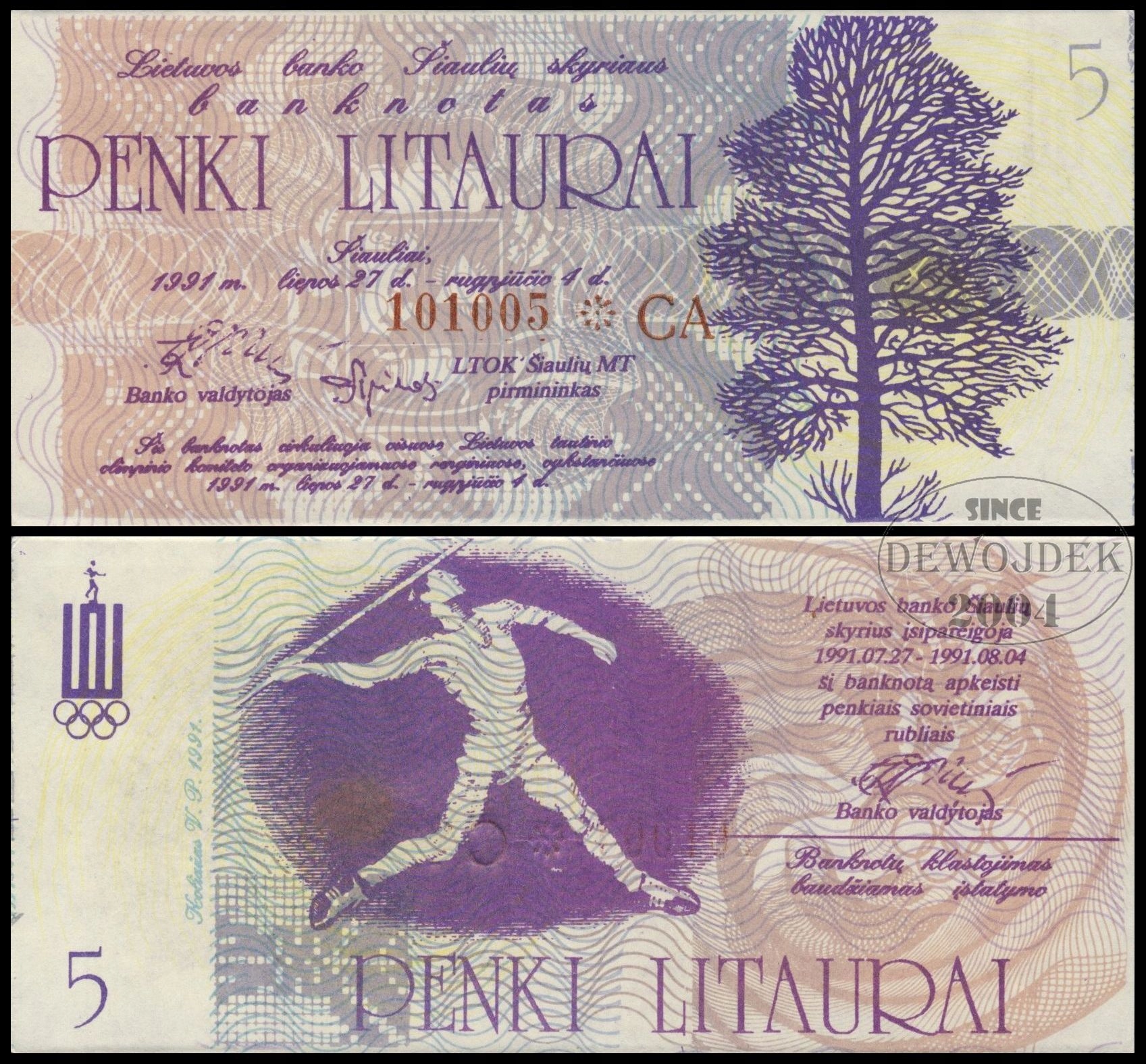 BNB - LITWA SZAWLE Šiauliai 5 Litów Litai 1991 # 101005 CA # 5 Litaurai UNC