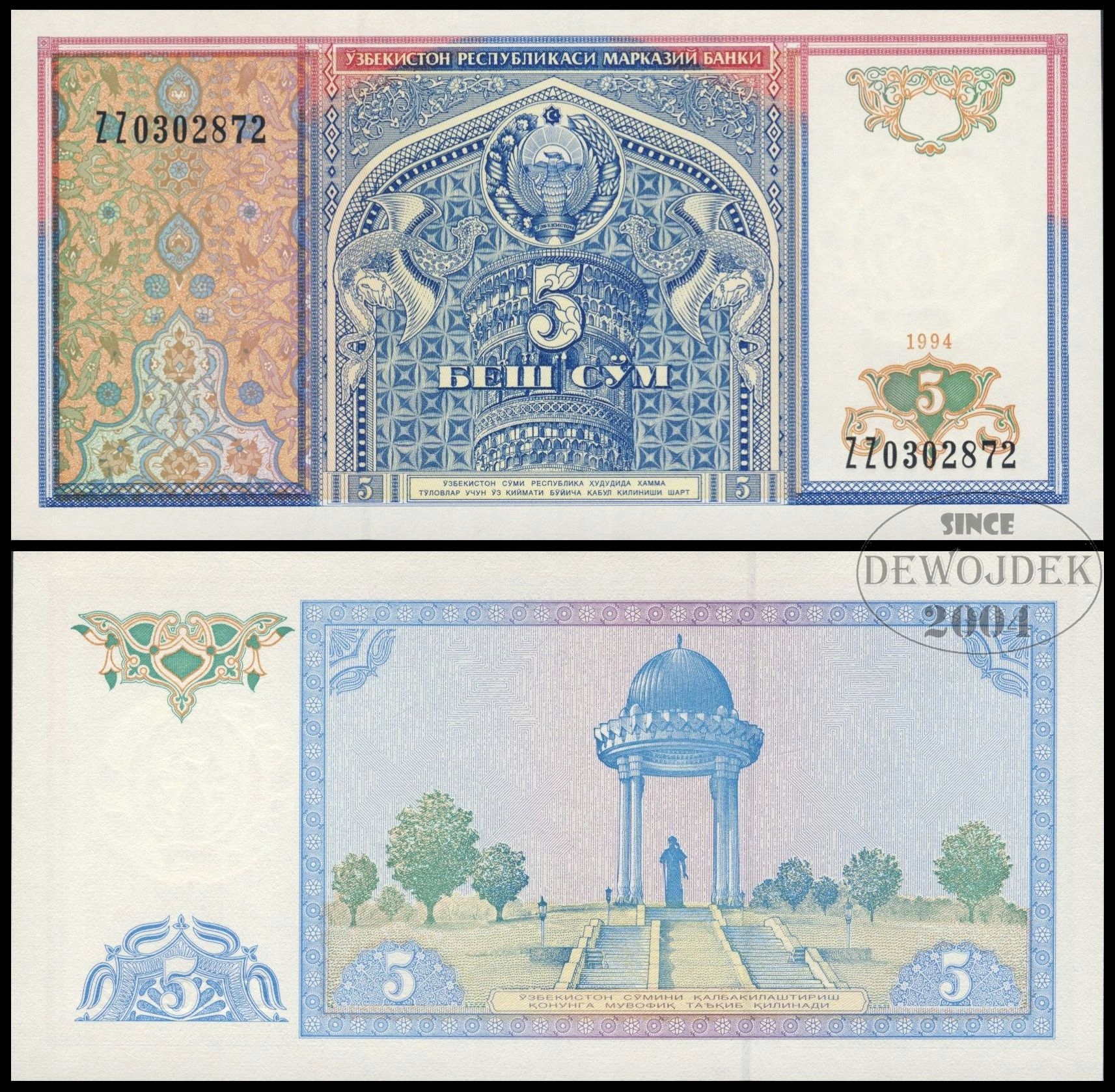 BNB - UZBEKISTAN 5 Sum 1994 ZZ 0302872 # P75r # SERIA ZASTĘPCZA # UNC