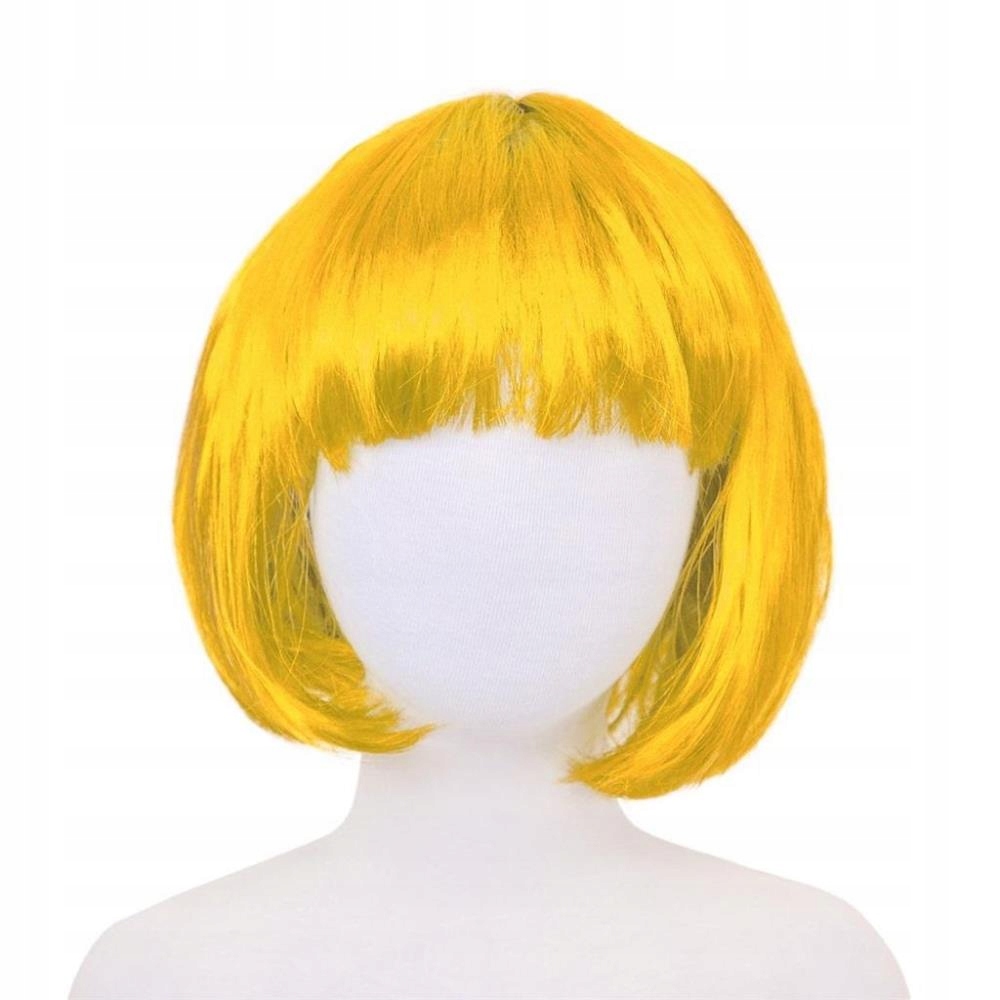 Перука, виготовлена з синтетичного волосся в жовтому кольорі. Зачіска в стилі "Боб" "вирізання з чубчиком. Доповнюючи стилізацію, маскуйте до карнавалу, Новорічна ніч, Хеллоуїн. Довжина волосся становить близько 25 см. Універсальна перука.