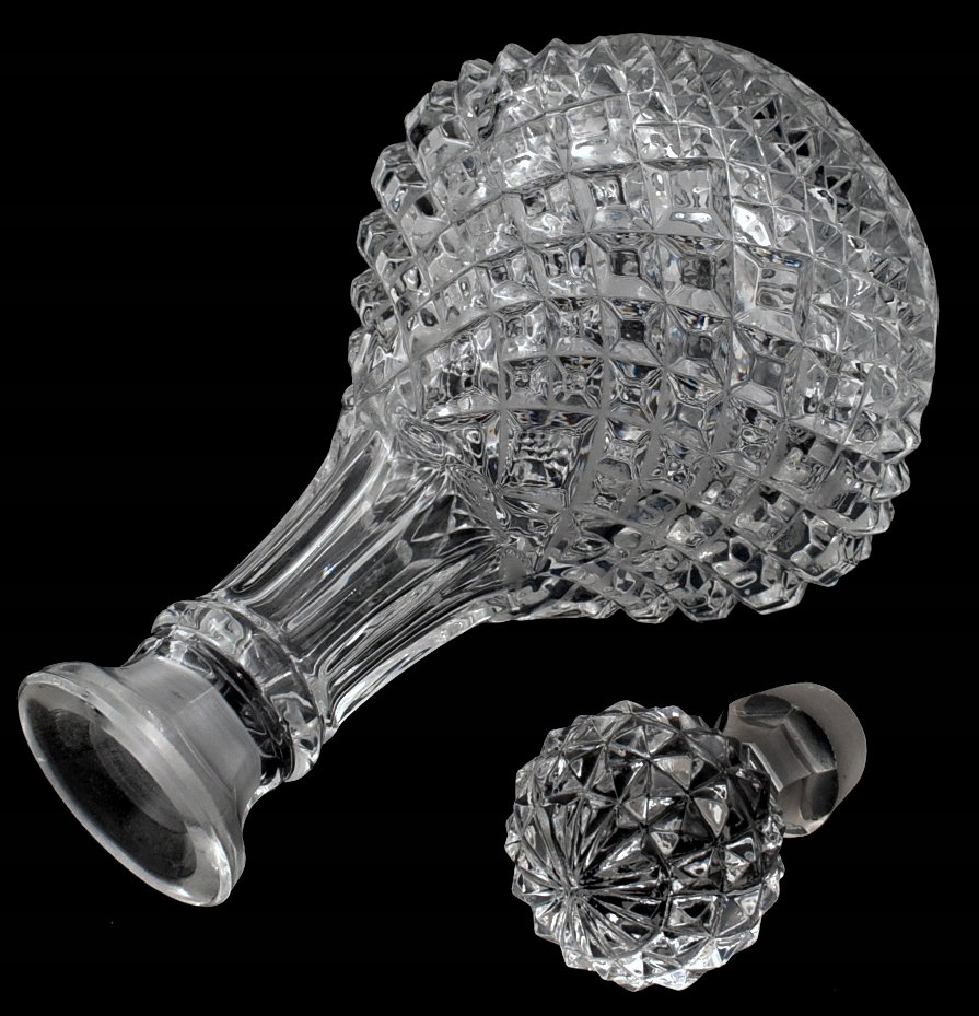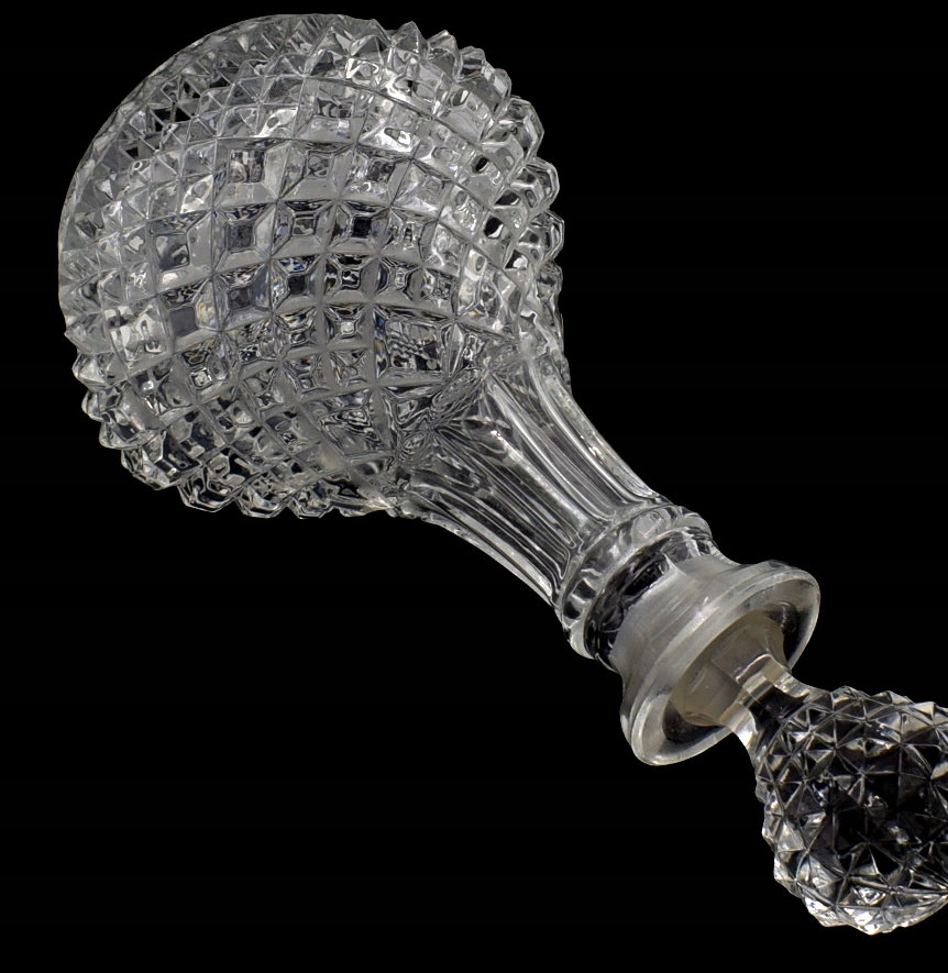 красивий, старий караф , виготовлений з дуже товстого, кришталевого скла . Дуже гарна якість скла, гарний декор. Масивний караф, важкий. Повна пробка.