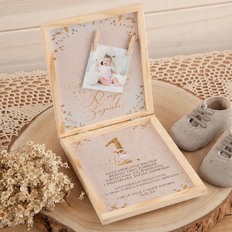 Побажання на рік у наборі зі скарбничкою — чудова ідея подарунка дівчинці на її перший день народження! Скринька виготовлена з натурального дерева, що лише додає чудових ноток стилю еко-рустик. Побажання розміщені на декоративній листівці в коробці з дерев'яними кліпсами, до якої можна естетично прикріпити фотографію або гроші.