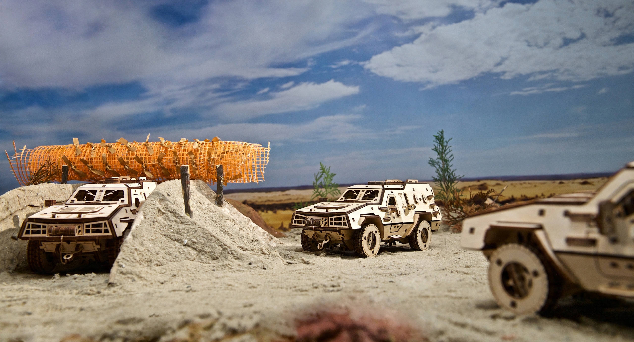 Модель UGEARS. Бойова машина «Дозор-Б» теж пишається українським виробництвом. Має «броню» у вигляді фанери товщиною 3,7 мм, повний привід, повну підвіску і пружинний двигун, що дозволяє долати велику відстань (близько 8 метрів). Бойова машина UGEARS Dozor-B має робочу лебідку, як її реальний аналог, для самостійного підйому або підйому транспортних засобів подібної ваги, тому що це UGEARS і тому, що ми любимо тішити та дивувати наших шанувальників крутими доповненнями. Витягніть лебідку, встановлену на передньому бампері, зачепіть її за якийсь предмет і дивіться, як вона потягне Дозор-Б вперед!