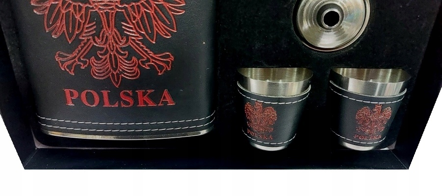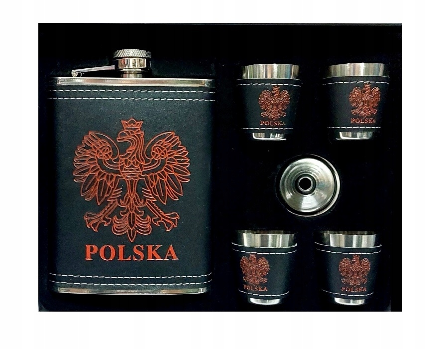 Приємна грудка з нержавіючої сталі, прикрашена мотивом орела. Ємність 250 мл. Це забезпечить спокійне та культурне споживання стрибкових напоїв у будь -яких умовах. Чотири окуляри та воронки включені. Розміри: 9,5 x 2,5 x 13,5 см. Окуляри: 4x30 мл. Ціле упаковане в декоративну коробку.