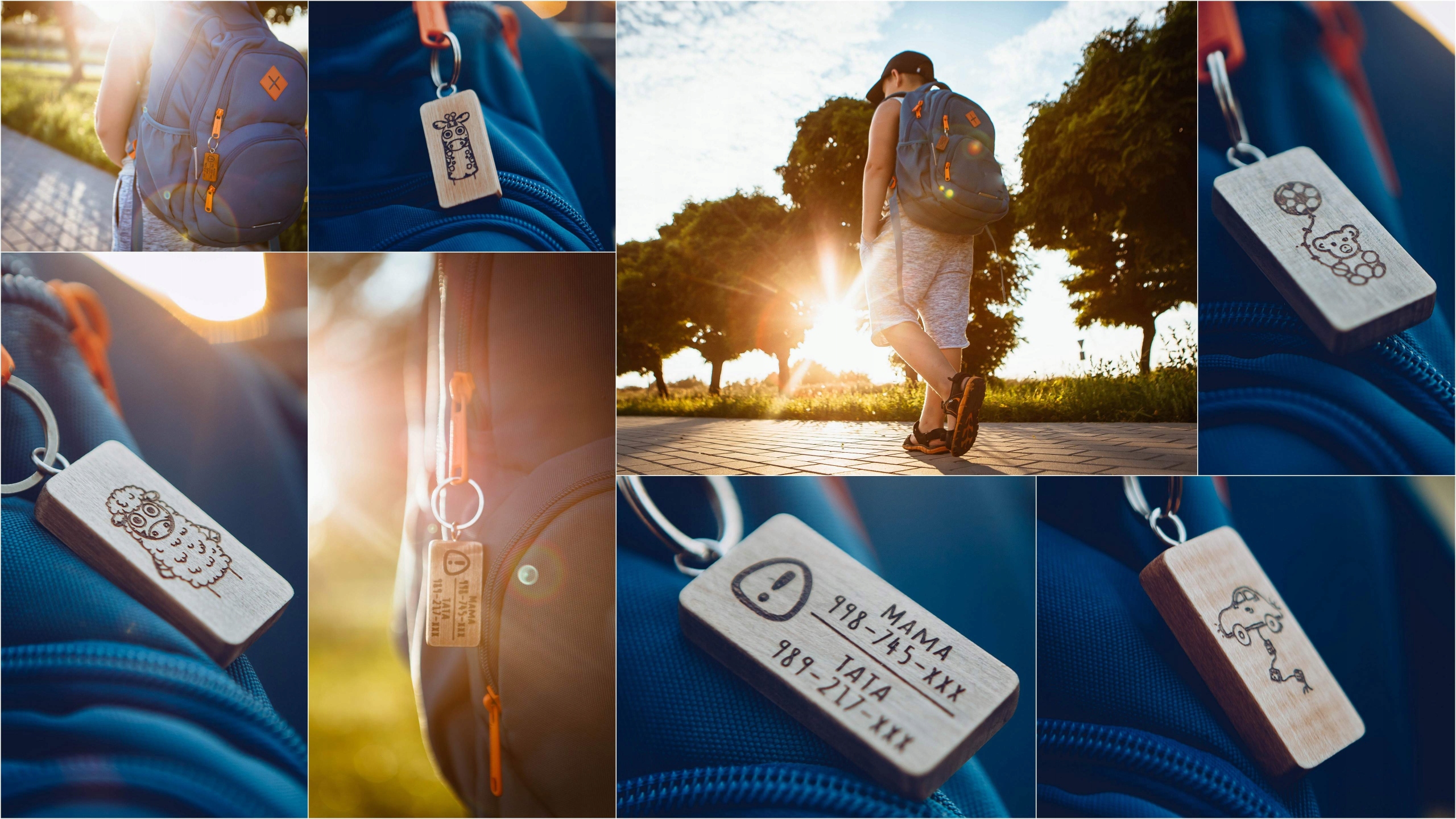 Брелок з двостороннім гравіюванням, з малюнок з одного боку та контактні дані батьків/опікунів з іншого.
