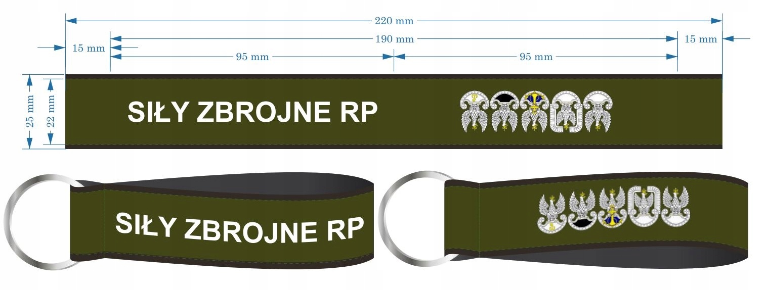 Чорний брелок з вшитою оливковою стрічкою з білими написами: SIŁY ZBROJNE RP та п'ятьма орлами польських збройних сил. Ширина 25 міліметрів, пришивна стрічка олива з принтом шириною 20 мм, довжина 10 см, діаметр металевого кільця 35 мм.