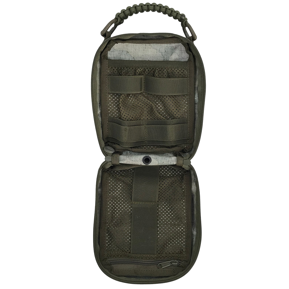 Зовнішня передня кришка аптечки має амортизаційний шнур (еластичний шнур, гумовий шнурок) із регульованим шнурком (ITW NEXUS). Shockcord - чудове місце для тактичного джгута CAT або SOFTT-W. Під аморткордом є 2 ряди стрічки MOLLE, що дозволяє прикріпити додаткове обладнання. У верхній частині аптечки є зручна ручка з паракорду.