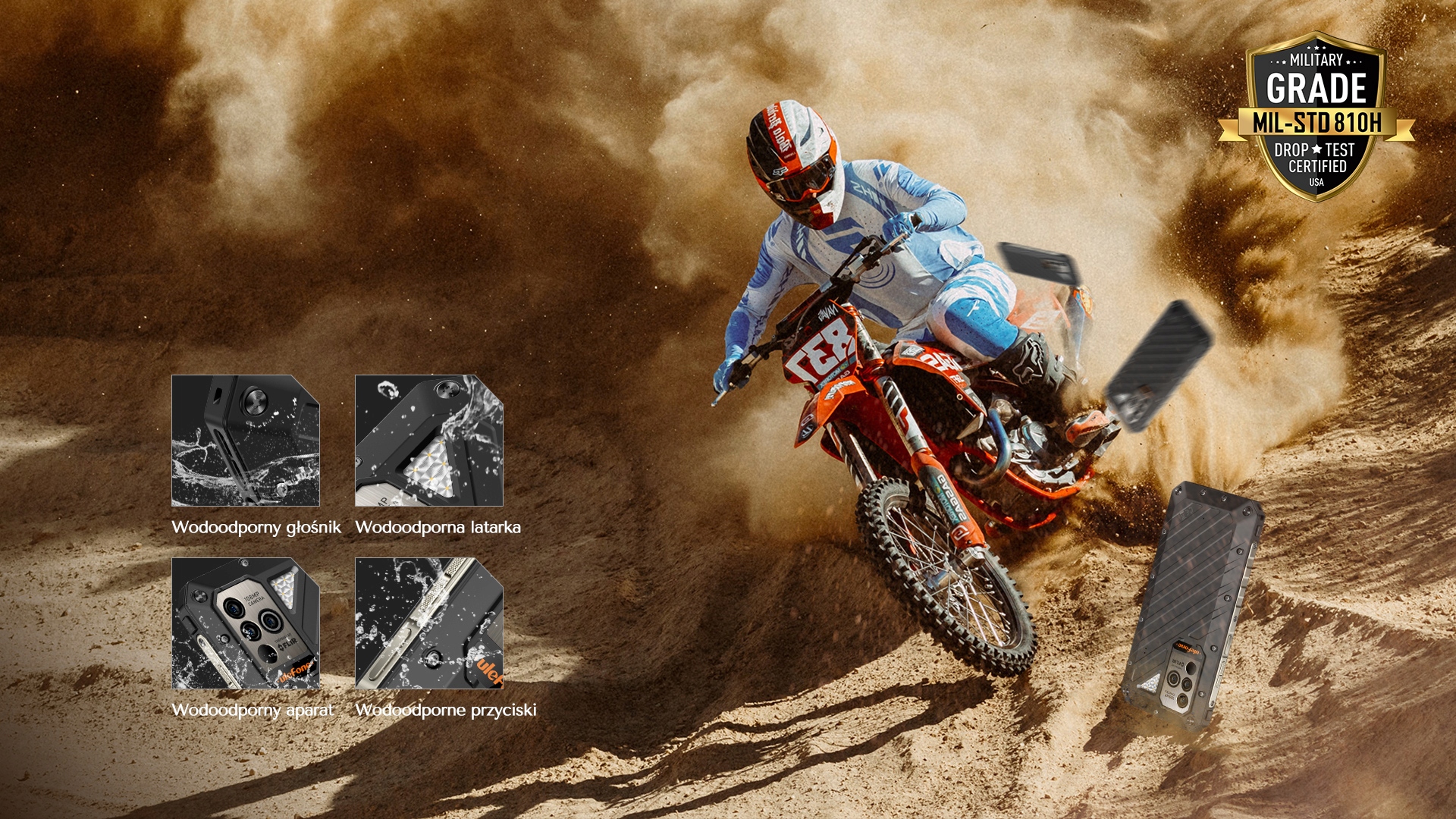 Ulefone Power Armor 19T із міцними зовнішніми елементами та посиленими компонентами — це повністю міцний, міцний і безкомпромісний телефон, який витримає будь-які умови. Відповідає стандартам MIL-STD-810H, неодноразово пройшов тестування на падіння на всіх поверхнях, кутах і краях, а також відповідає стандартам IP68 і IP69K, забезпечуючи найвищий захист від води, пилу, бруду, піску, вологи та навіть соляного туману.