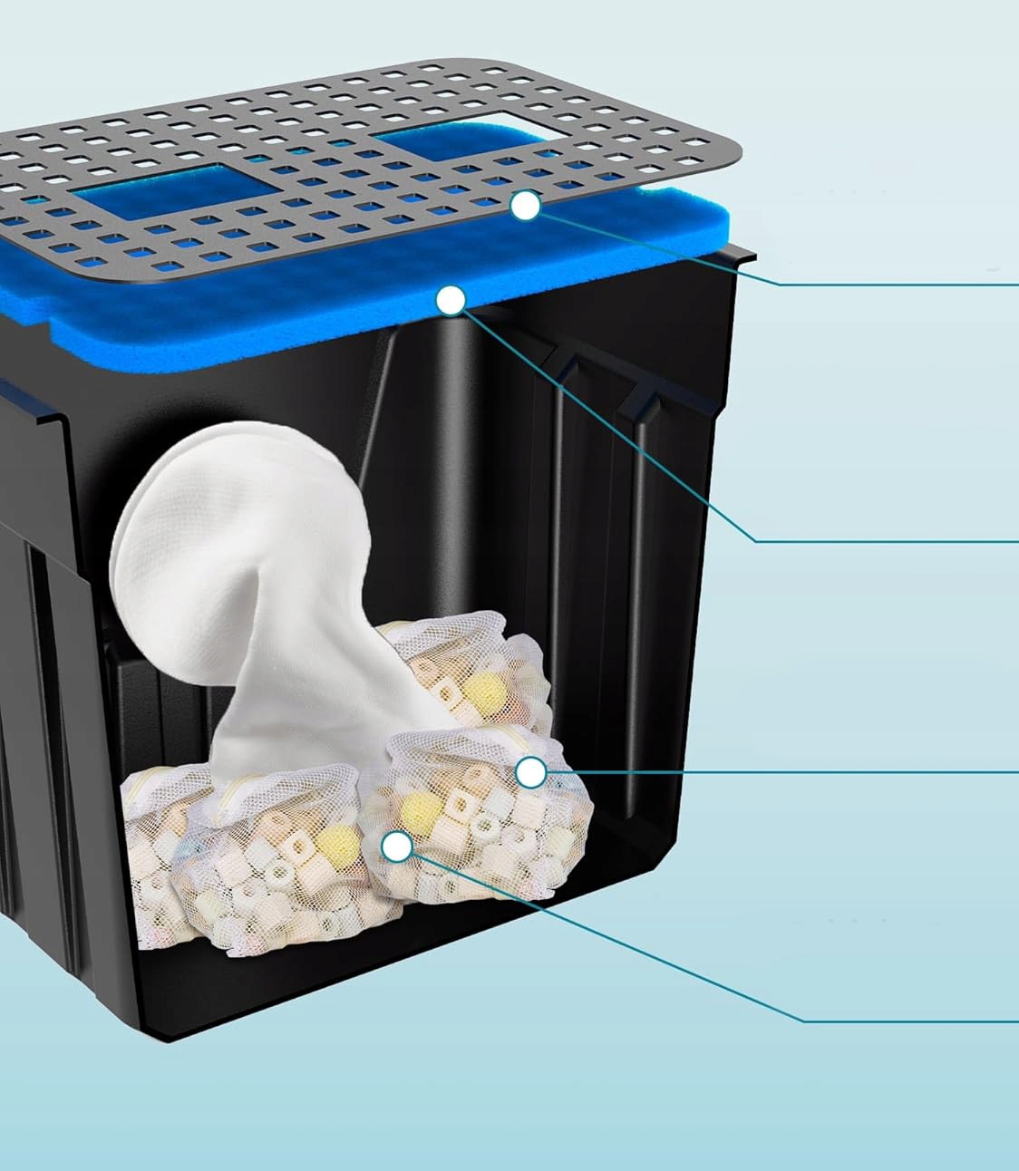 Повна система фільтрів Забезпечення кристально чистої води: набір містить губку фільтра, органічні кульки фільтра та пакетики фільтрів, які ефективно очищають воду. Він піклується про чистоту та здоров'я вашого ставу, підтримуючи життя води та створюючи яскраве, природне середовище, яке порадує кожного любителя саду.