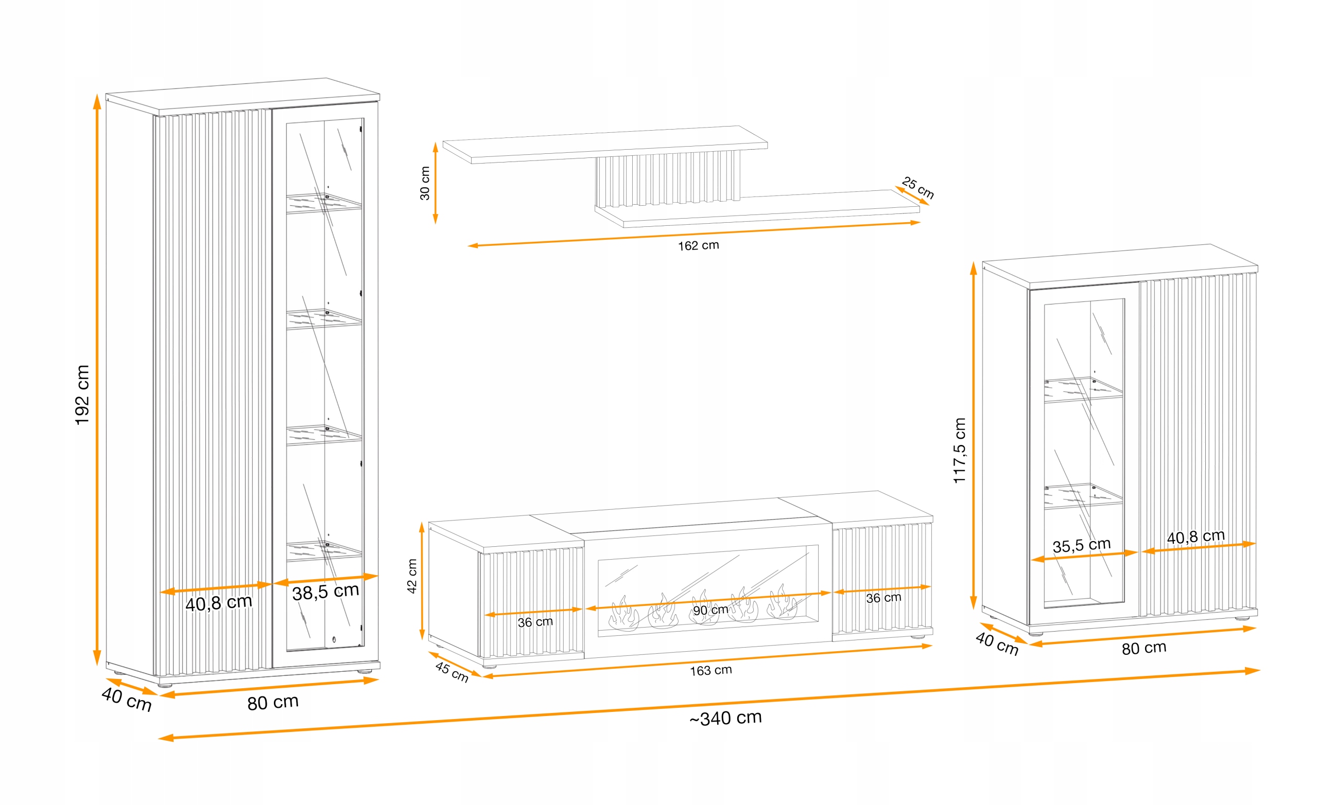 Загальні розміри (Ш/В/Г): ~340 см / 192 см / 45 см