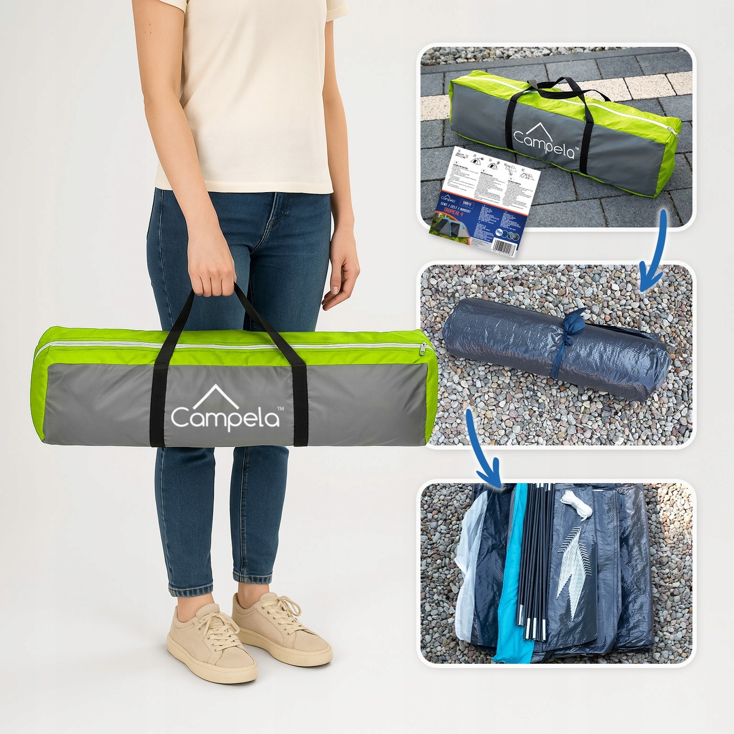 ➡ під рукою та світлом Сумка полегшує транспорт і зберігання - він легко поміститься в багажник автомобіля або більший ручний багаж. вага 4 кг і компактні розміри після складання (65 х 14 см) зробіть намет легким у транспортуванні та зберіганні на ходу.