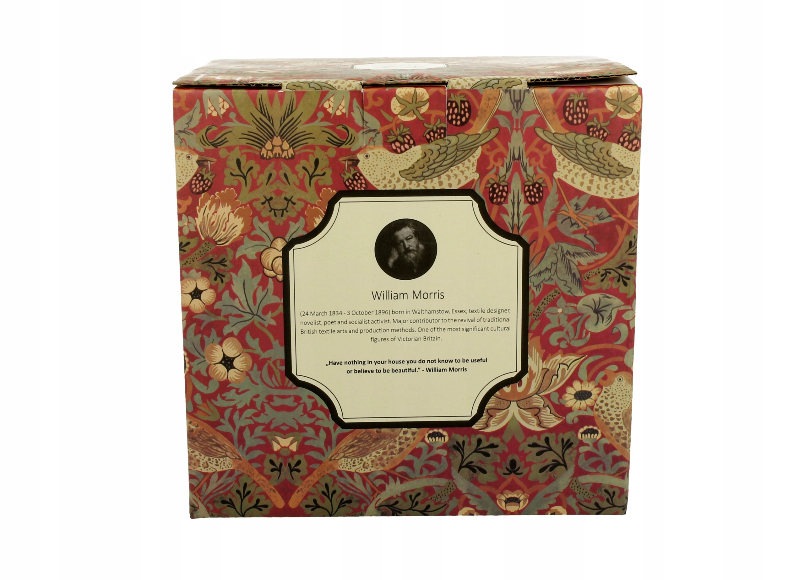 Вільям Морріс був англійським художником, ілюстратором, архітектором, дизайнером, письменником і поетом валлійського походження 19 століття. Він був провідним членом руху мистецтва та ремесел, і його погляд на поєднання мистецтва та промисловості заклав основи для еволюції дизайну. Він активно пропагував радість ремесел і красу природи. Характерні візерунки Морріса, навіяні кружляючими виноградними лозами, квітковими мотивами та химерно переплетеним листям, можна знайти на шпалерах і тканинах, а тепер також і на наших порцелянових виробах, таких як чашки та кухлі, упаковані в привабливу та естетичну подарункову упаковку.