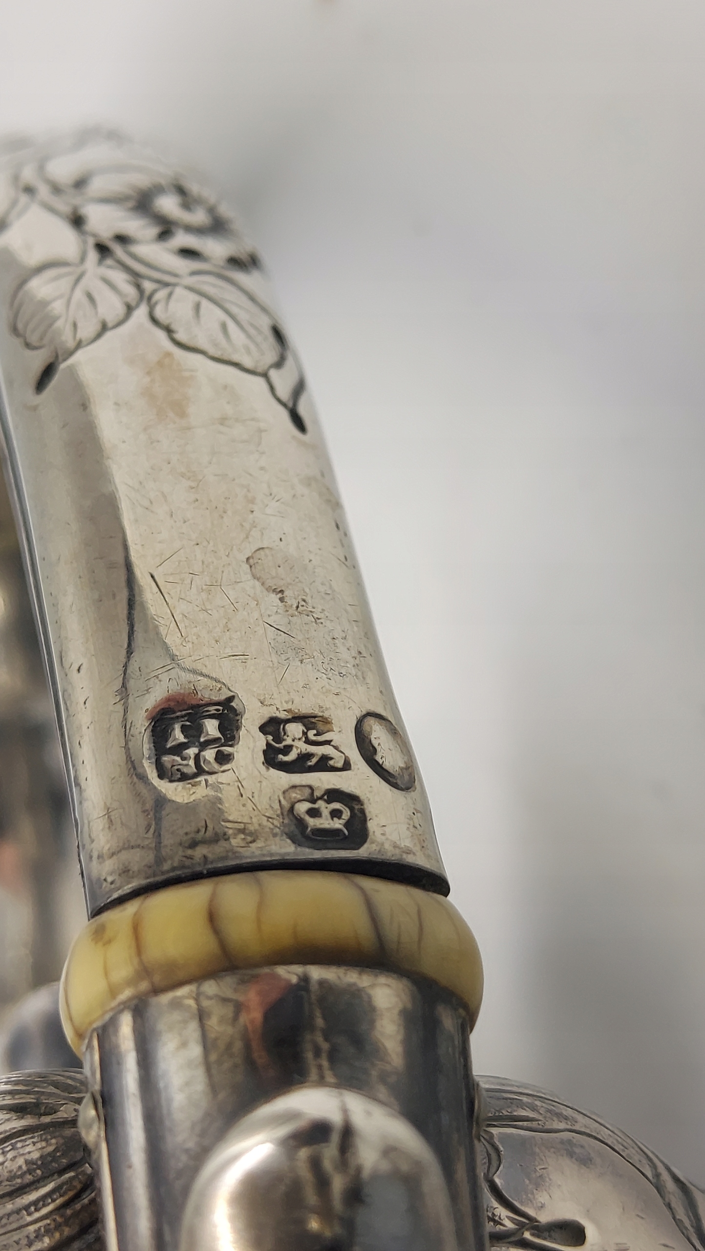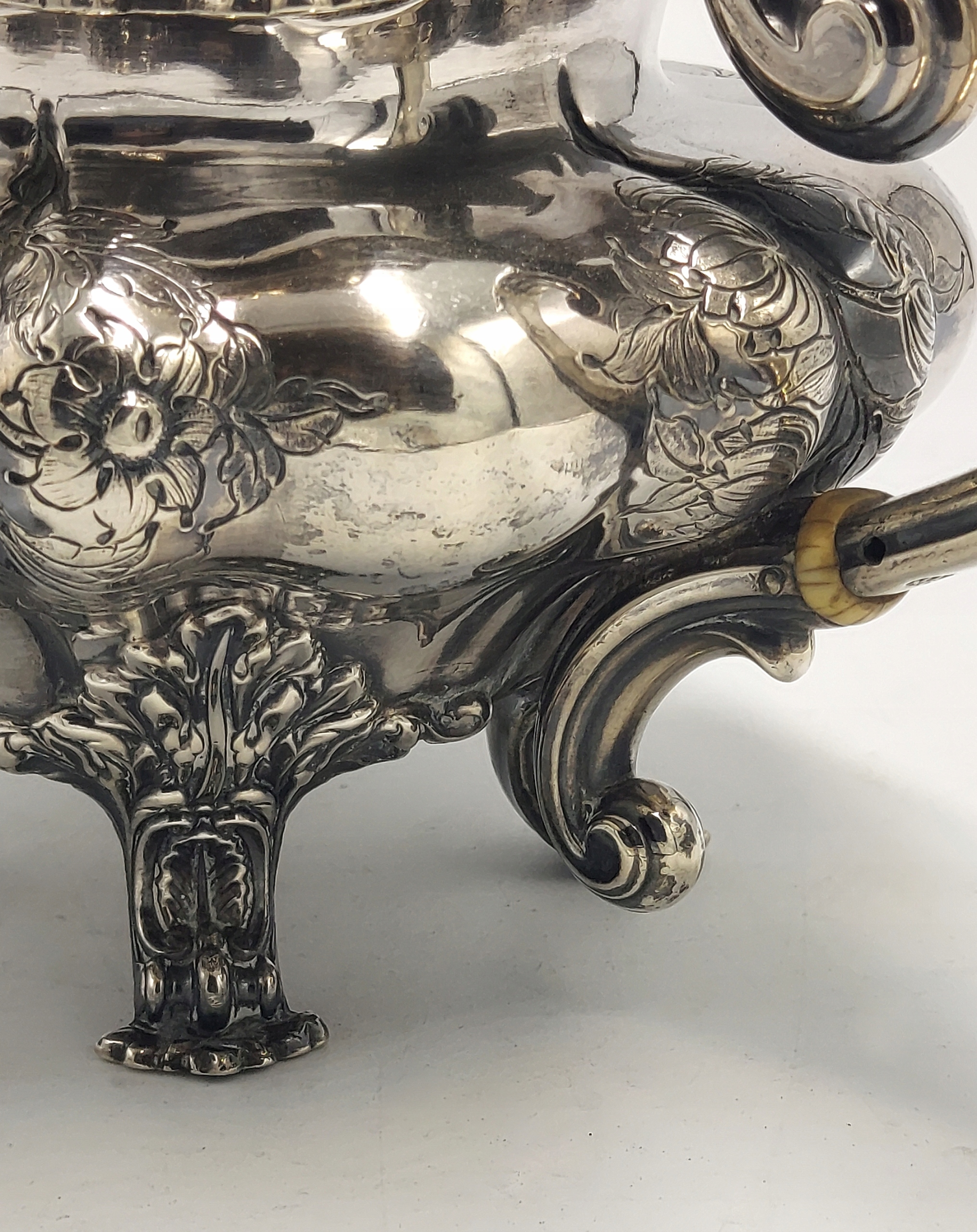 Горняк виготовлений повністю зі срібла, має надзвичайно чарівну форму і нагадує дуже низький чайник. Глечик кріпиться на 4 гарно вирізаних коротких ніжках у вигляді ЛАП ЛЕВА. Ручка досить велика і закручена всередину, дуже зручна у використанні з елементами кольору слонової кістки, які запобігають нагріванню ручки. Окрасою є рельєфний рослинний мотив на черевці глечика. Краї кришки також чудово прикрашені квітами, а сама її ручка створена у вигляді квітки. Підписано, серед іншого, знаком лева, що вказує на срібло.