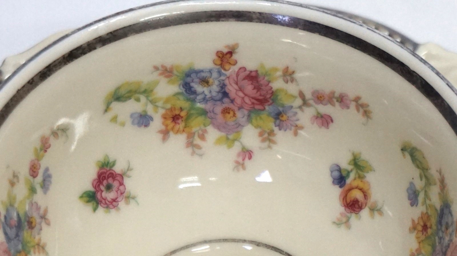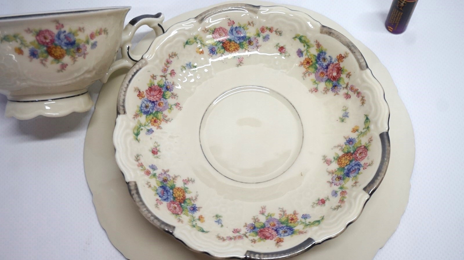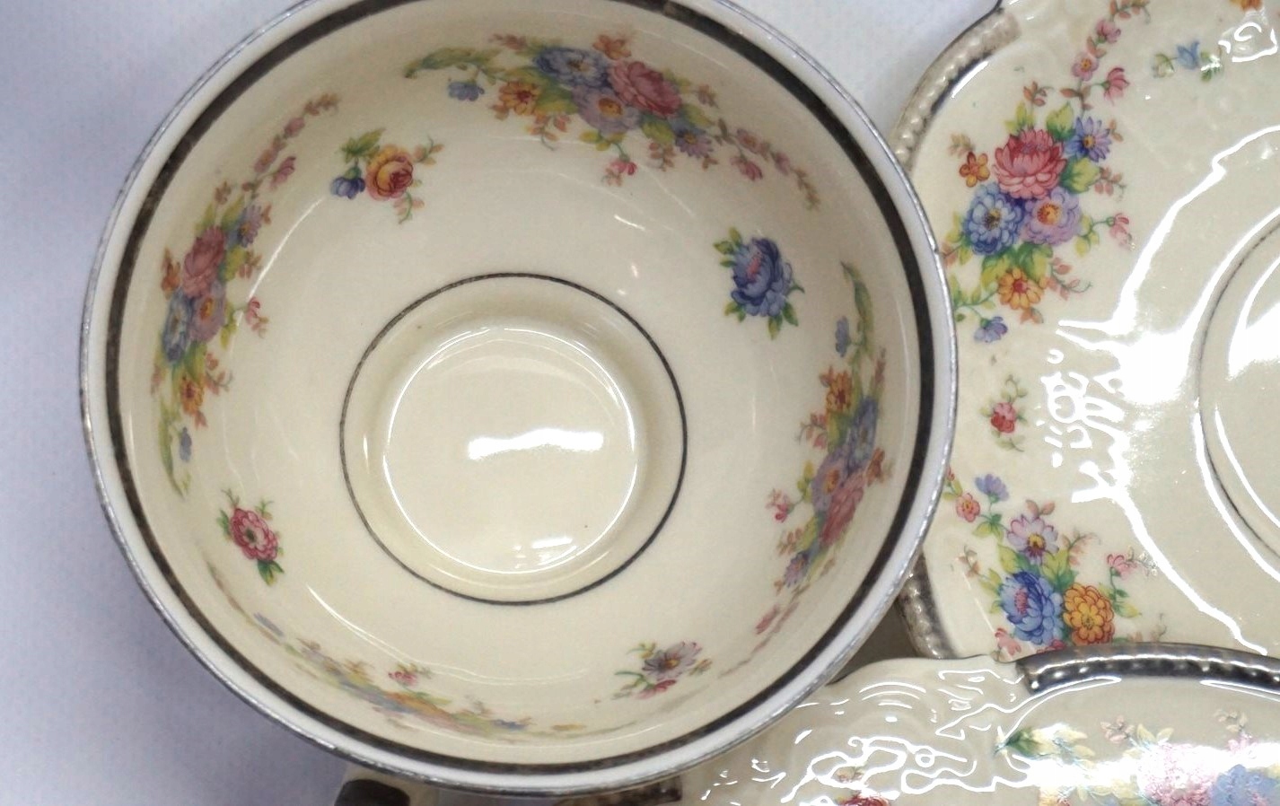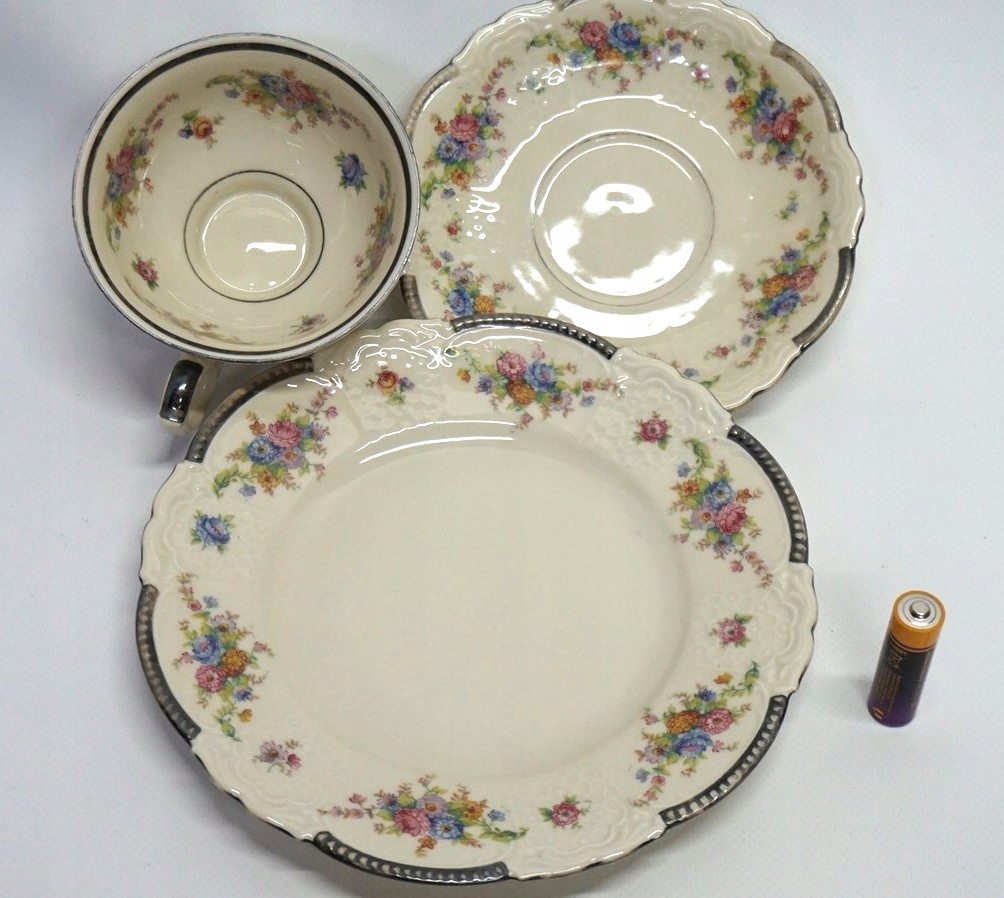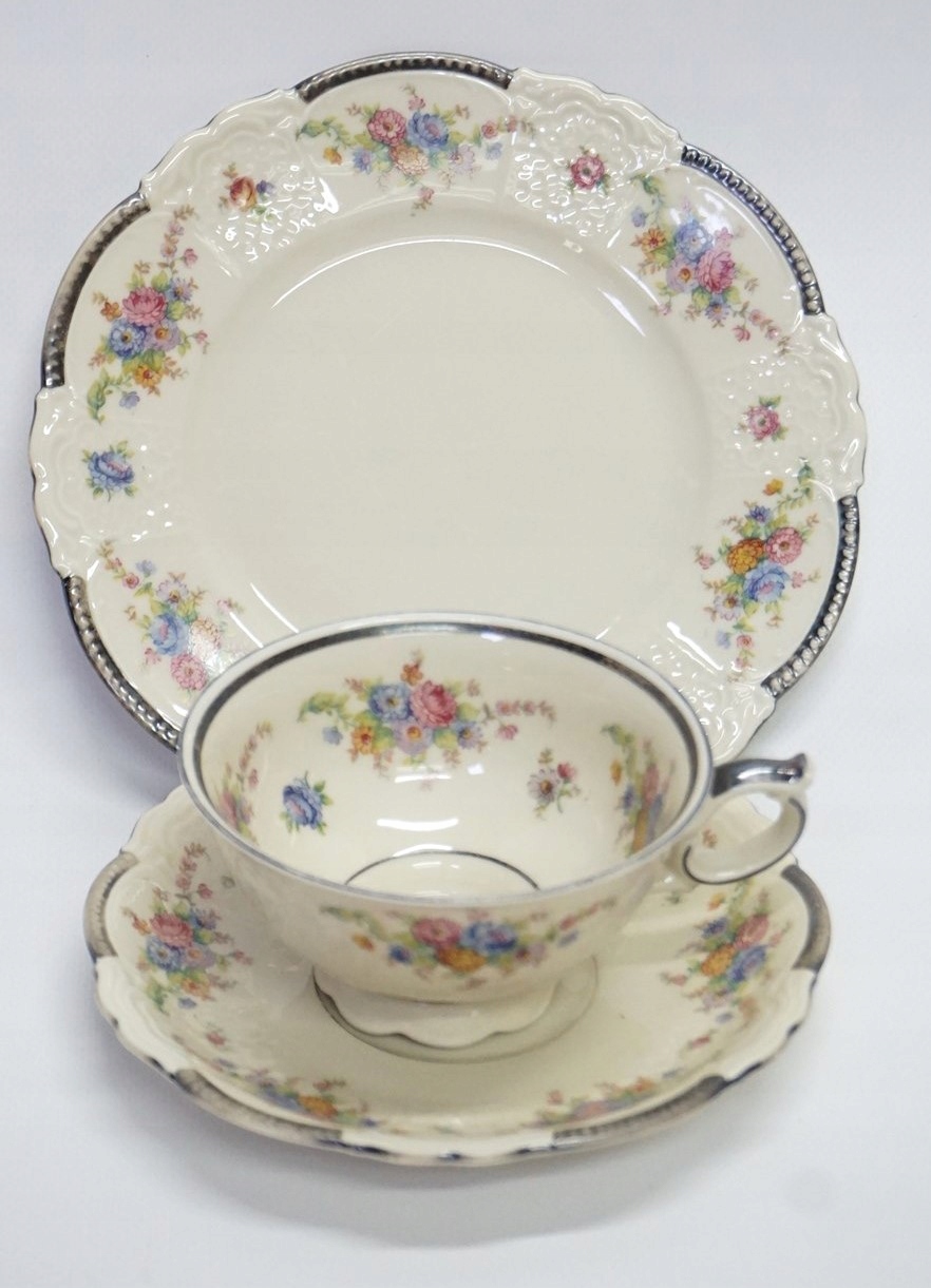 Порцеляна білого та кремового кольорів, рясно посріблена, багато прикрашена квітковим мотивом.