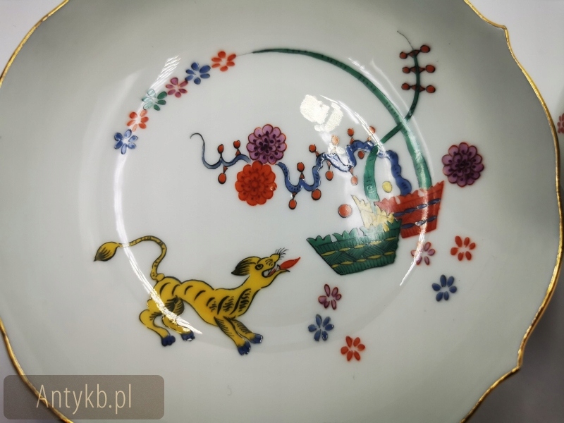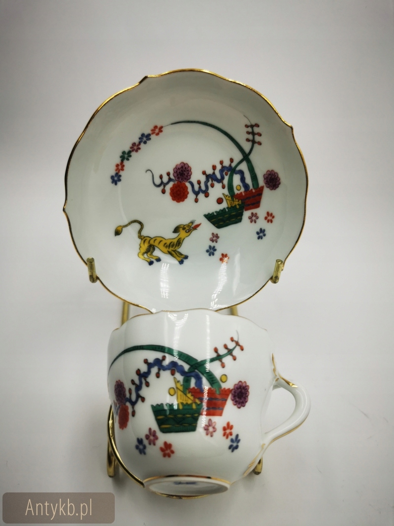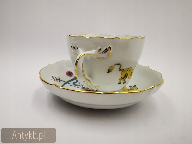 Представляємо справжній раритет на колекційному ринку - чашку з чудової фабрики в Мейсені, з мотивом, взятим зі східної культури, у вигляді тигра/лева/дракона.Маркування, дві кобальтові шаблі з видимим крапка над схрещеними лезами свідчить про те, що він виготовлений у першій половині 20 століття. Стан дуже хороший і рекомендований, без видимих сколів чи інших дефектів. Його безперечною перевагою, окрім красивого дизайну, є нерівна лінія краю, вкраплена золотом, і більша висота блюдця.