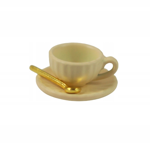 Міні металева чашка з тарілкою і ложкою кольору екрю, в набір входить: чашка, загальна висота 5 мм, верхній діаметр 9 мм, тарілка діаметром 12 мм. мм, металева ложка золотого кольору довжиною 11 мм. Дуже маленька мініатюра для лялькового будиночка 1:12.