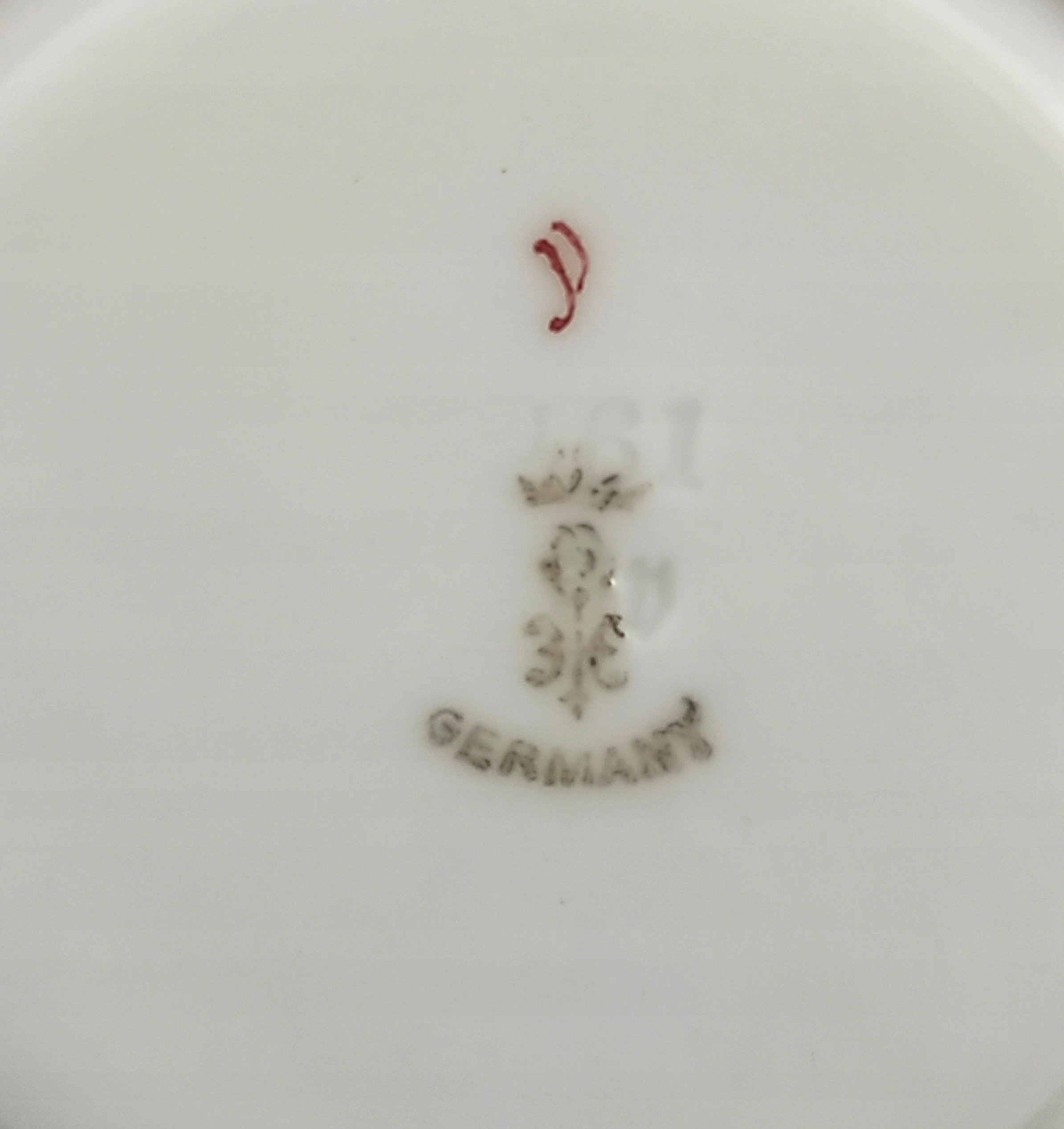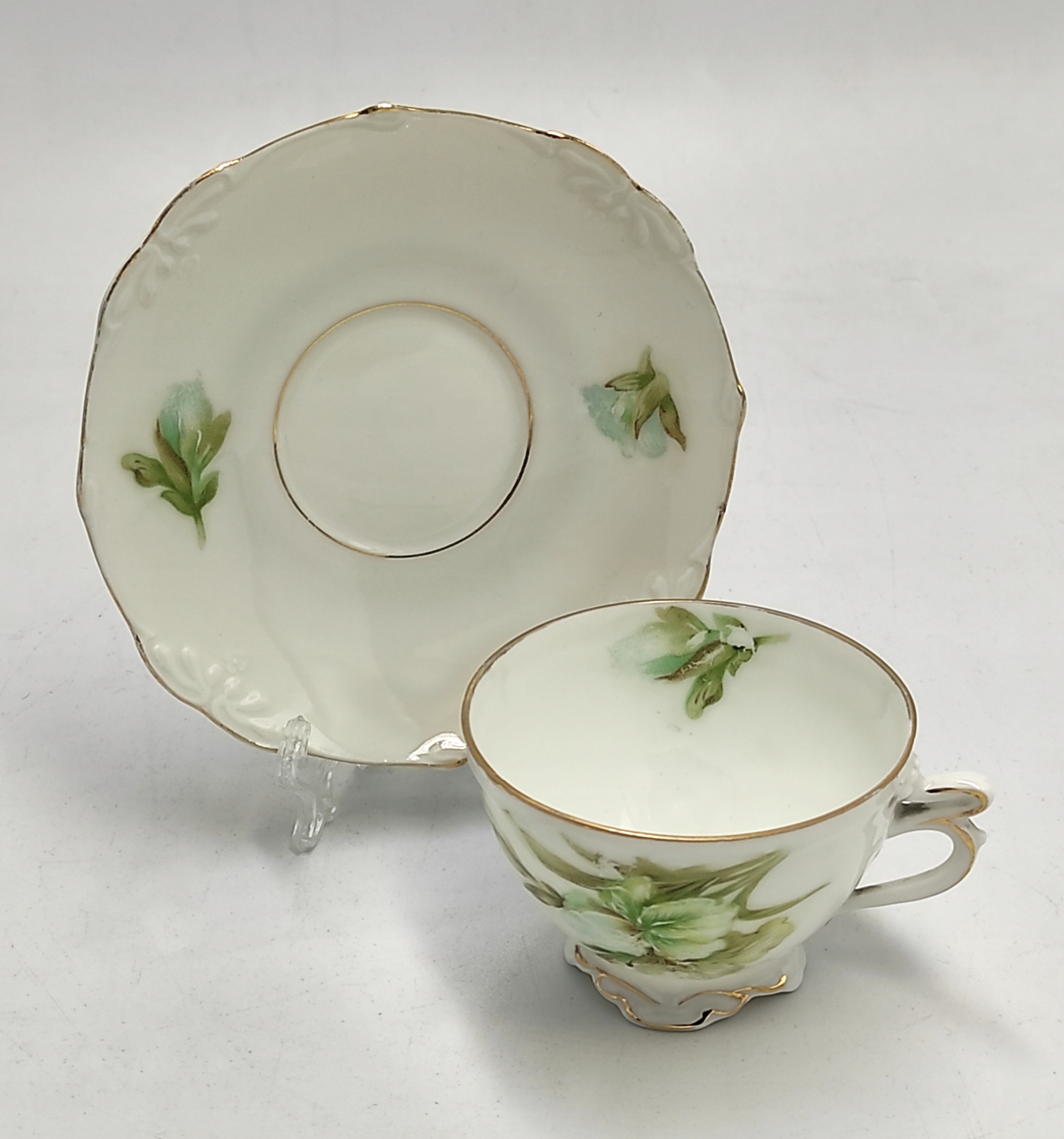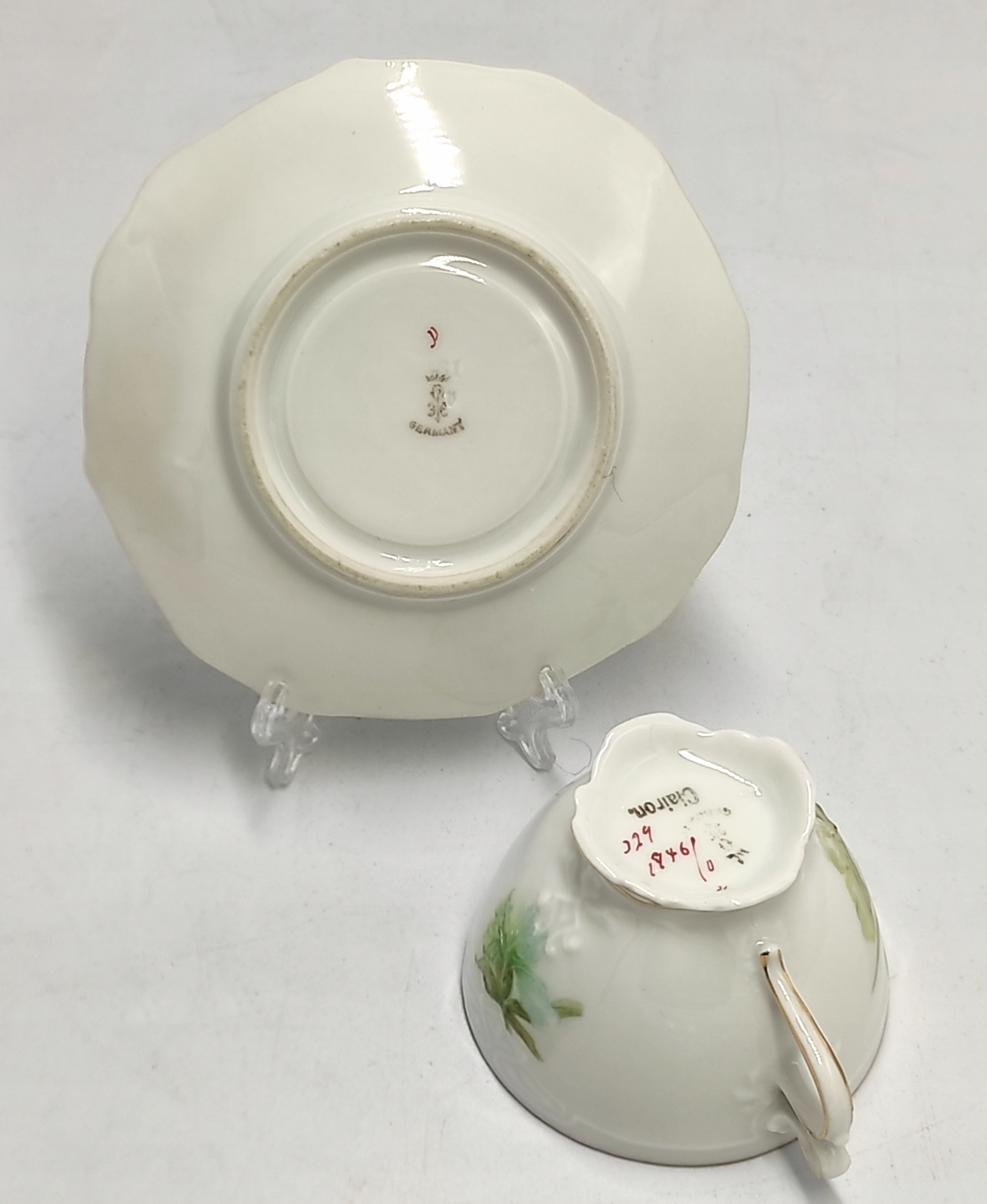 Виготовлена з високоякісної тонкостінної білої порцеляни. Глазуроване та багато рельєфне. Він прикрашений дуже тонкою золотою позолотою та красивим квітковим декором у зелених тонах.