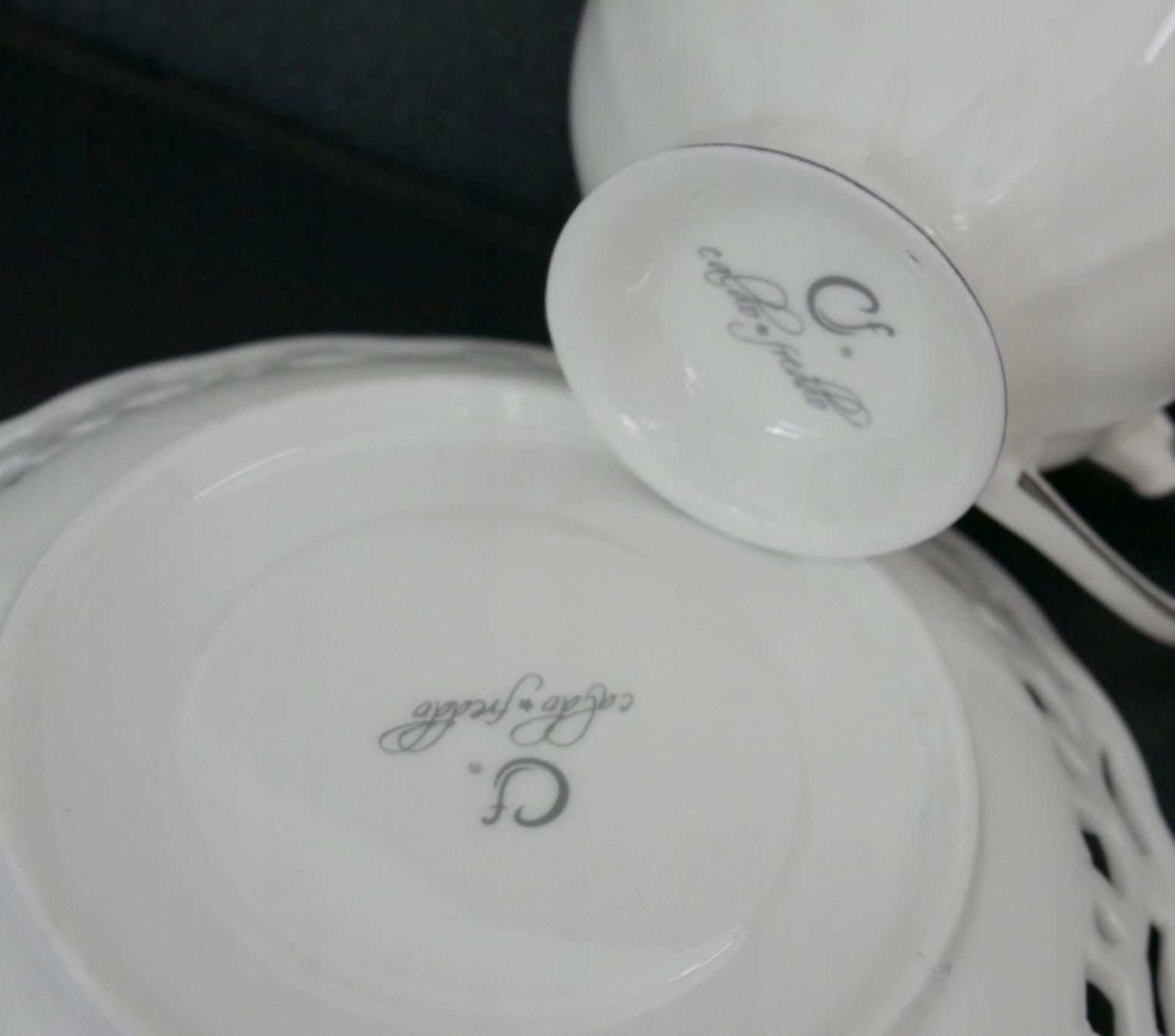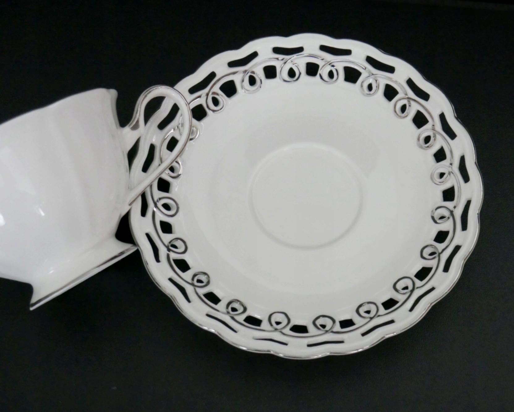 білою, товстостінно стіновою порцеляновою порцеляном, новішим поколінням, відкритою роботою на краю підставки, сріблястим ободом
