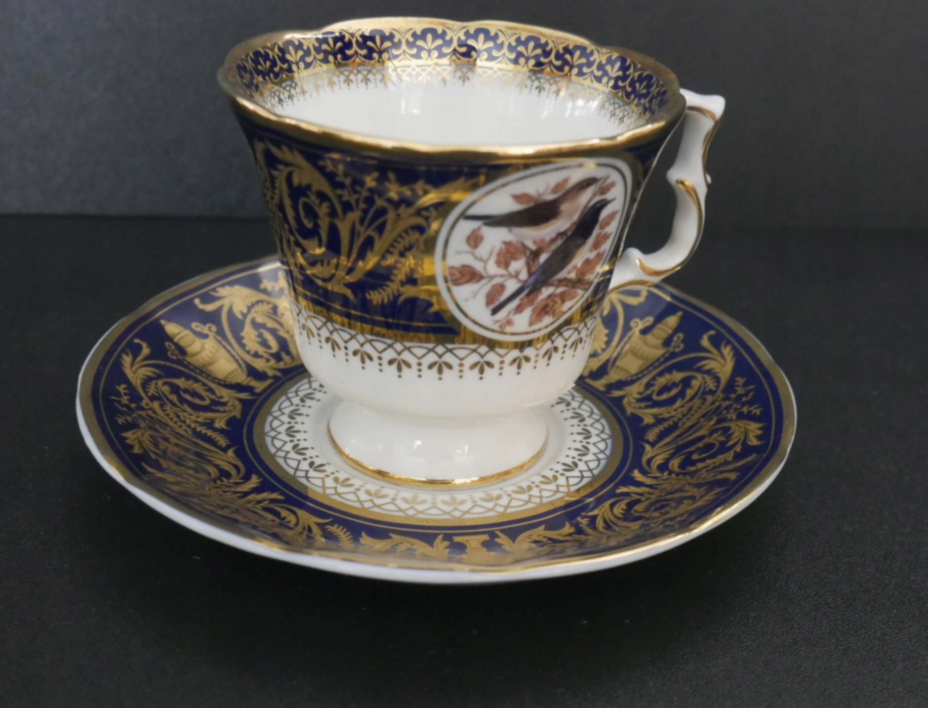 чашка з блюдцем, з пташками на животі, кобальтово-синій та золотистий декор, Китай
