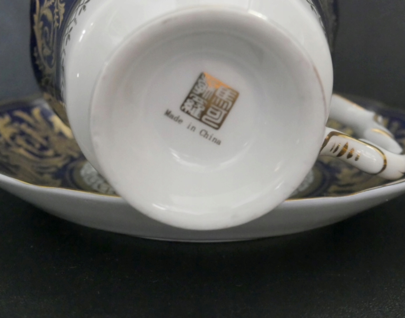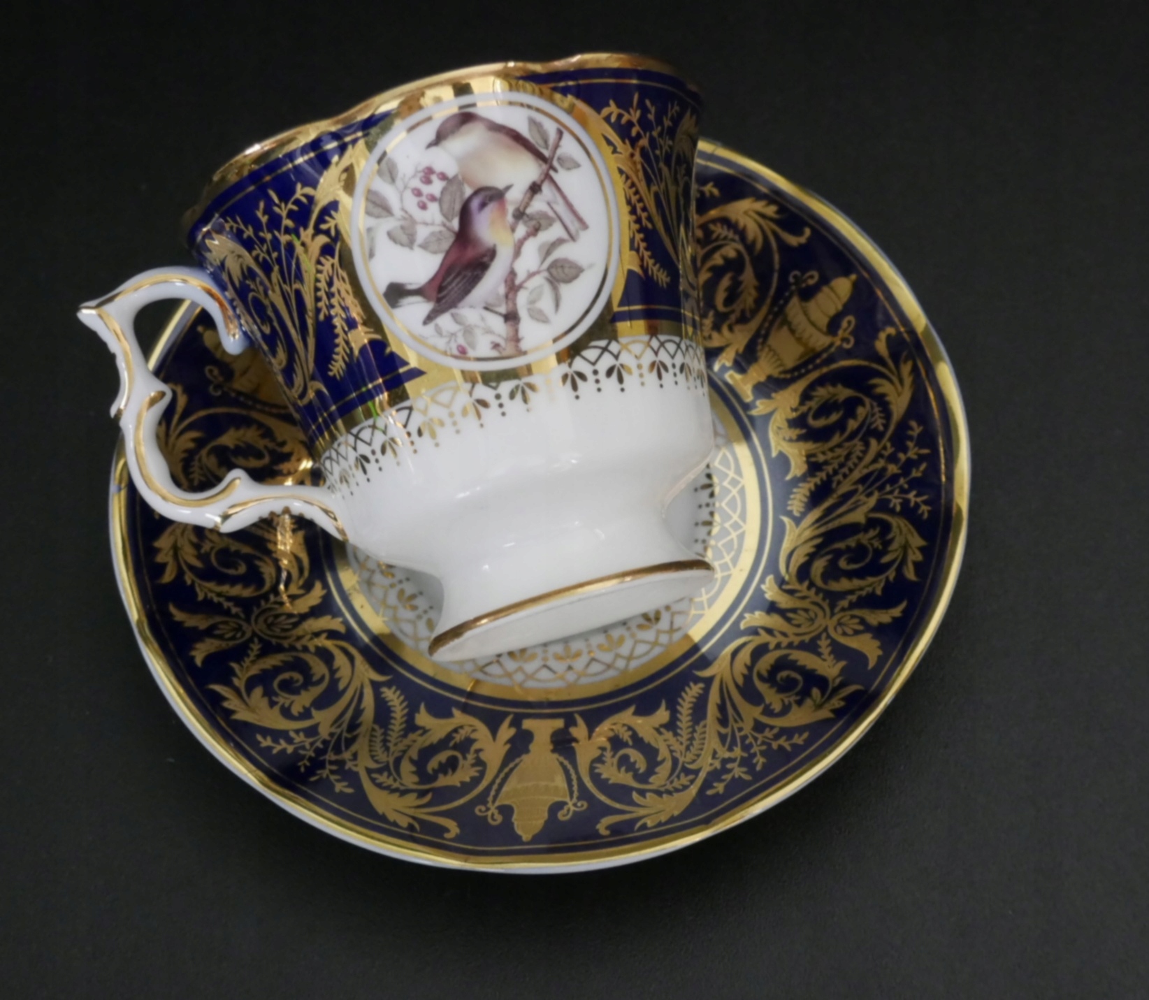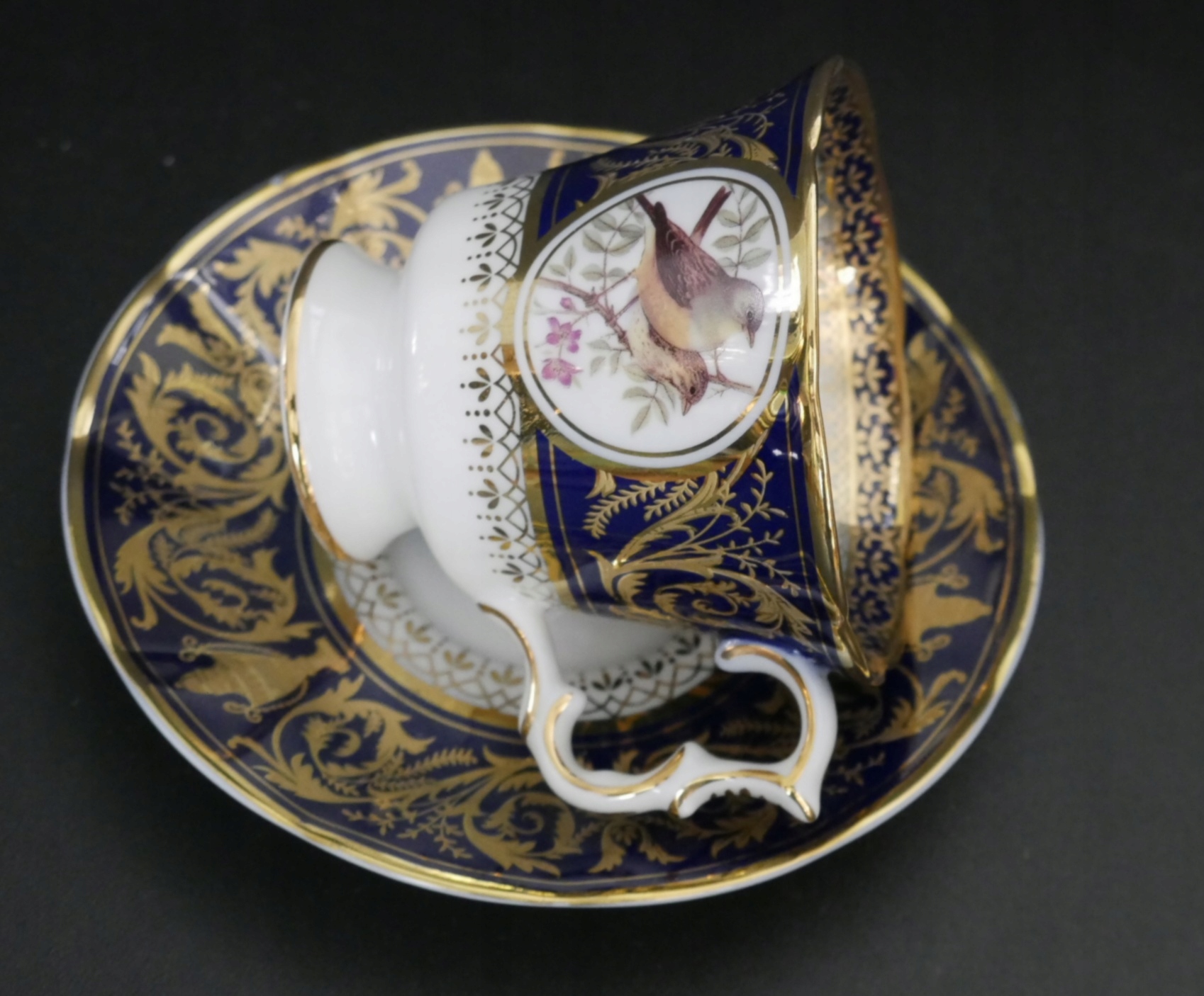 чашка з блюдцем, з пташками на животі, кобальтово-синій та золотистий декор, Китай