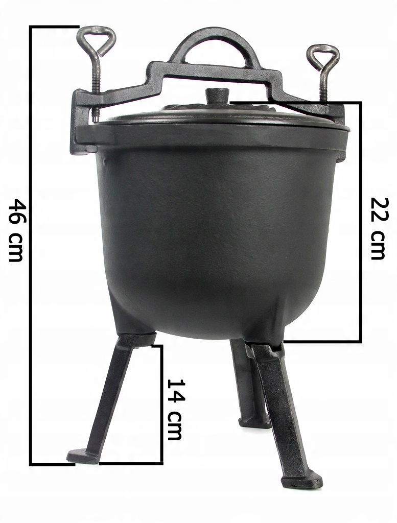 Оригінальний казанвиготовлений з найякіснішого чавунного сплаву, стійкого до найвищих температур. Спеціальний вентиляційний отвір в кришці, який регулює тиск всередині казана, що робить його 100% безпечним. Зсередини покритий термостійкою емаллю, яка захищає і оберігає внутрішню частину казана, що полегшує його миття і догляд (не потрібно просочувати після кожного використання). Казан можна стояти прямо на вогні, а завдяки зручній ручці його можна також підвісити над вогнем. Виріб також має роз'ємні ніжки, тому казан можна поставити в камін або прямо у вогнище. Завдяки тисненню на обкладинці ви можете бути впевнені, що купуєте оригінальний і безпечний продукт.