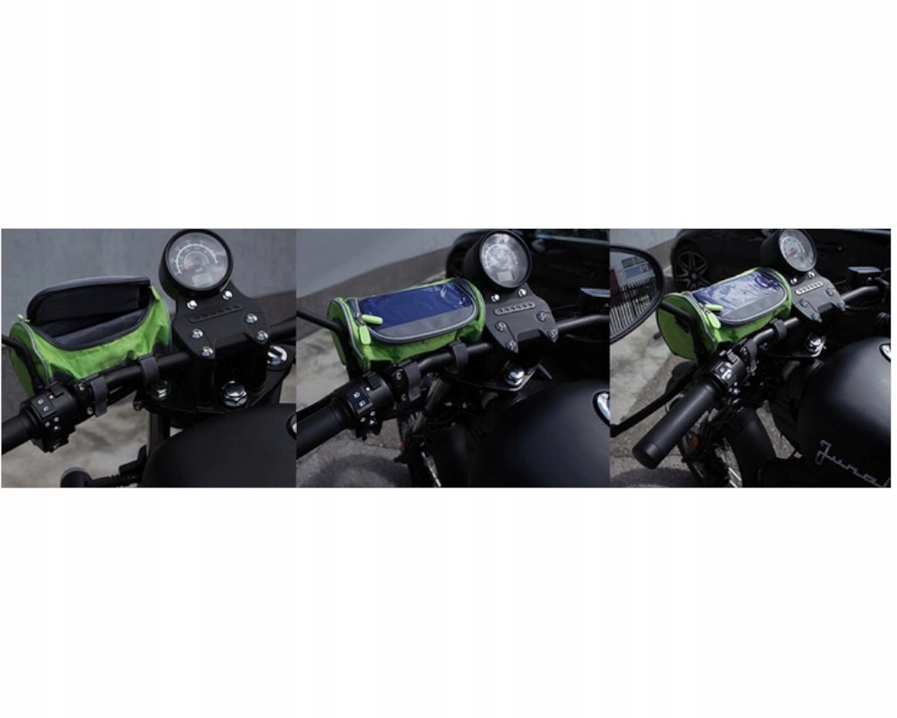 Сумка закривається на блискавку з двома бігунками. У верхній частині сумки є місце для телефону або навігації з прозорим віконцем з ПВХ. Прозоре вікно дозволяє керувати телефоном за допомогою сенсорного екрану. Відділення для телефону обшито поліетиленовою губкою та застібається на міцну липучку, щоб телефон не міг випадково вислизнути. У нижній частині є місце для документів, ключів або інших речей.