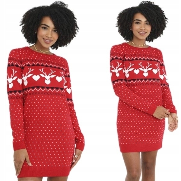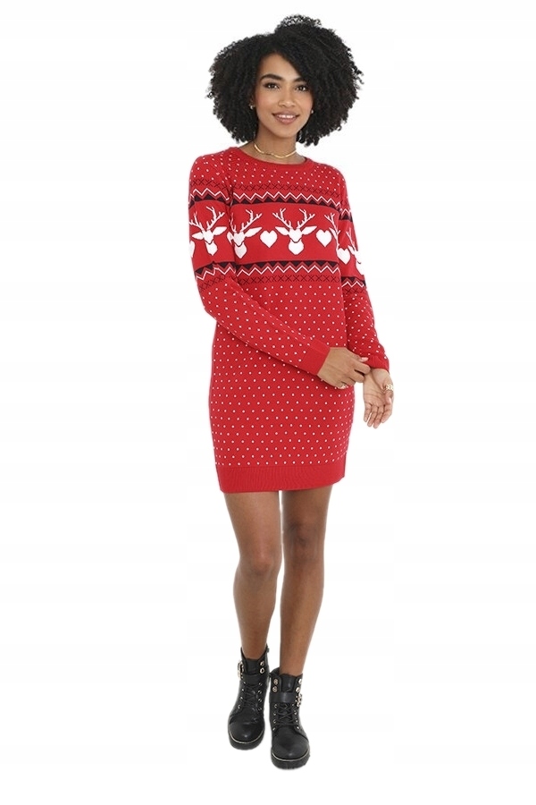 Різдвяна сукня-светр. Контрастні кольори. Червоний з норвезьким малюнком. Малюнок на переді та рукавах, спинка гладка. Міні-сукня, круглий виріз, довгі рукави.