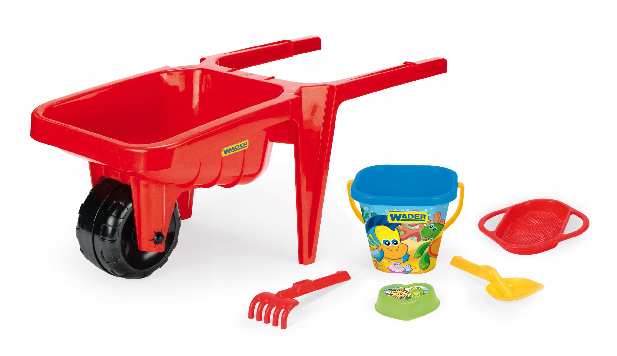 Червона гігантська тачка ідеально підходить для гри як на пляжі, так і в саду чи вдома. Його можна використовувати для транспортування піску, блоків або інших предметів (вантажопідйомність до 100 кг). Літній набір, що містить відро, цвіль, ситечко, обійми та лопатка, було прикріплено до тачки. На відрі є барвиста графіка, виготовлена за методом IML (вбудована безпосередньо в матеріал, завдяки якому він стійкий до води та сонця). Гра з тачками та іграшками з піском підтримує фізичну активність дітей, покращує їх координацію та ефективність руху та вчить співпраці в групі. Ціле виробляється в Польщі з безпечних та довговічних матеріалів.