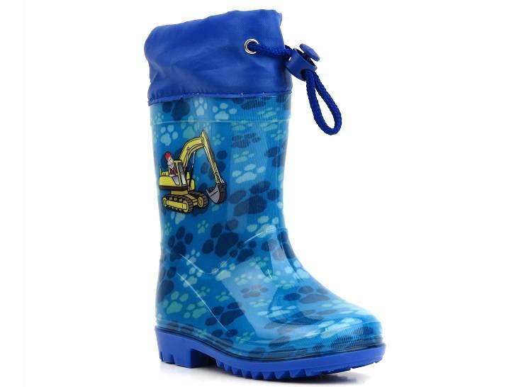 Черевики Wellington виготовлені торговою маркою American Club. Взуття виготовлено з міцної гуми, завдяки якій вода вільно стікає по ньому. Всередині текстильний матеріал. Веллінгтони мають шнурок у верхній частині верху, який допомагає захистити ногу від потрапляння води всередину взуття. Товста підошва завдяки своїй конструкції запобігає неконтрольованому ковзанню. Сапоги прикрашені милими лапками та візерунком у вигляді екскаватора.