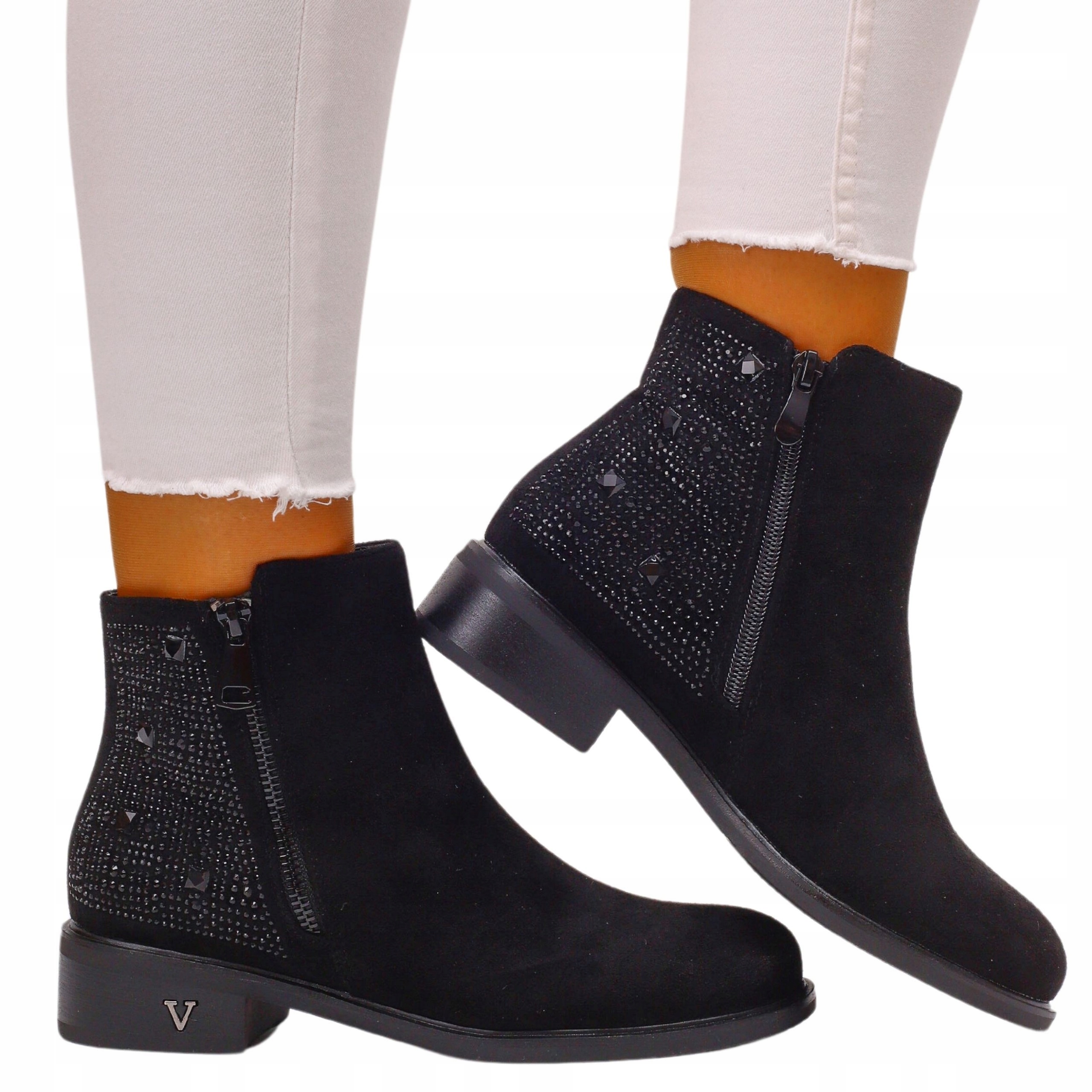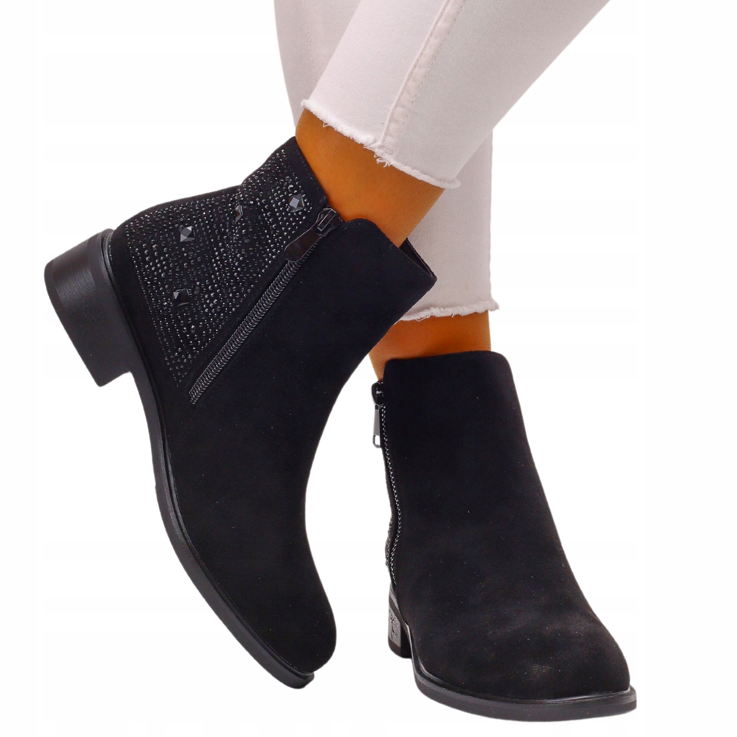 Жіночі ботильйони чорного кольору. Вони застібаються на блискавку, що полегшує їх надягання. Стійка, товста підошва добре амортизує стопу, виготовлена з якісних матеріалів. Завдяки простому дизайну вони поєднуються з багатьма стилями.