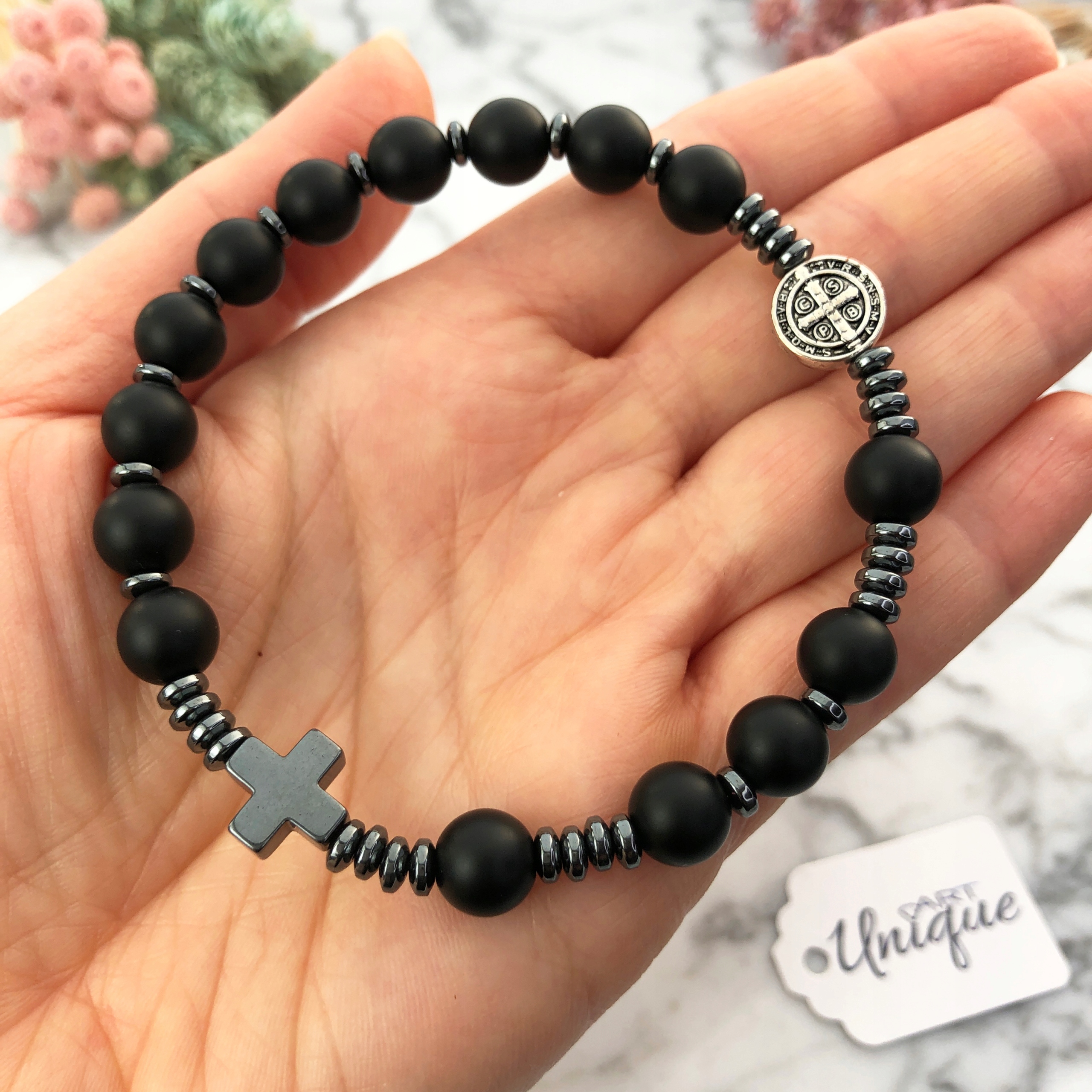Браслет з натуральних декоративних каменів - матовий онікс і гематит з св. Бенедиктна міцній подвійній силіконовій гумці.