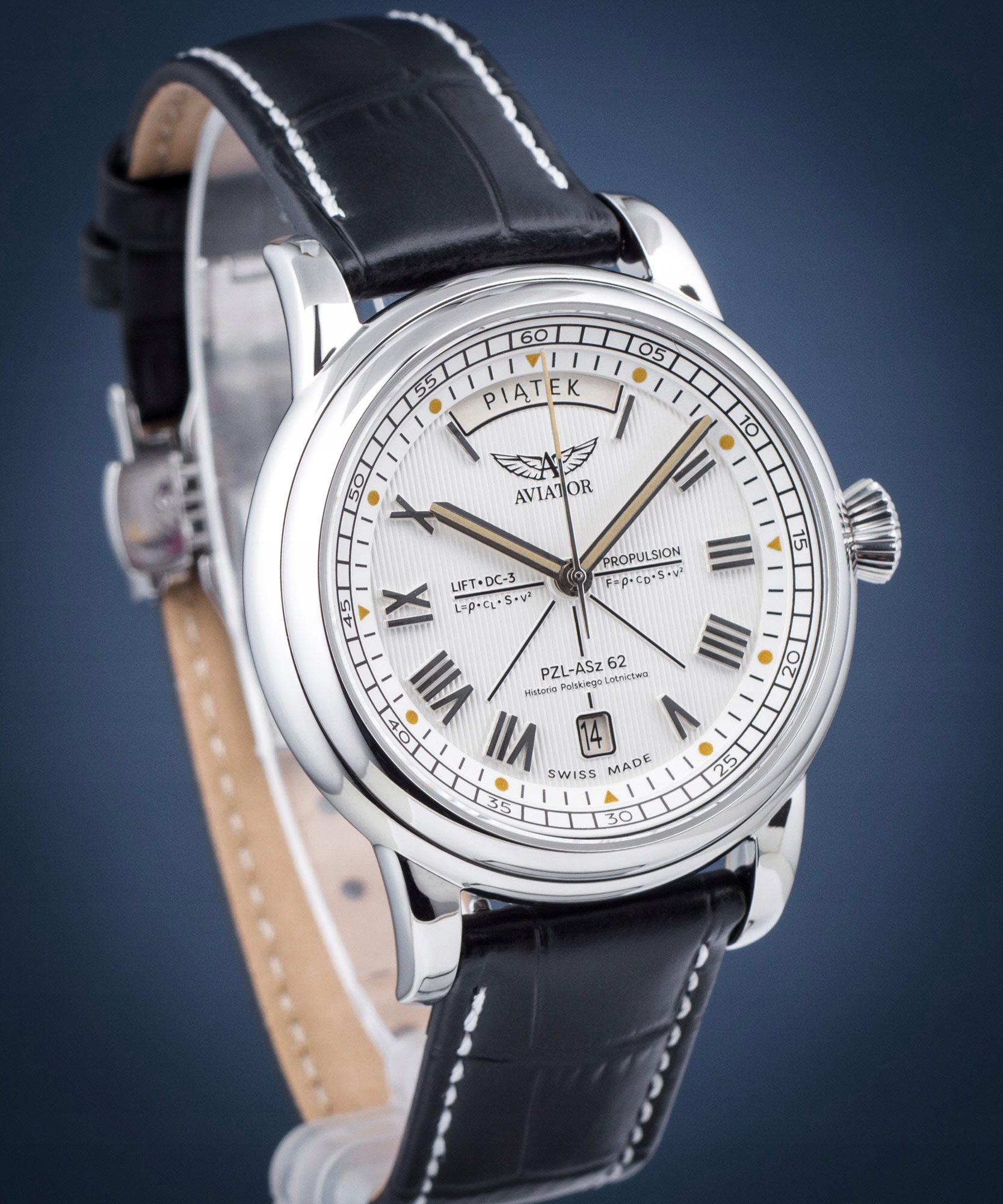 Польський лімітований чоловічий годинник Aviator Douglas Day-Date V.3.35.0.281.4 PL — ідеальний годинник для будь-якого випадку. Циферблат захищений міцним сапфіровим склом з антибліком і захований механізм AV-1000 на основі SELLITA SW240-1, 26 каменів, запас ходу 41 год корпус на основі нержавіючої сталі. Водонепроникність цієї моделі встановлено на 100 метрів.