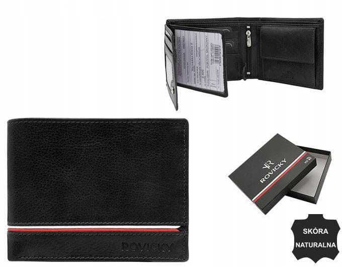 Великий гаманець, виготовлений з натуральної шкіри, без зовнішнього застібки. Захищена мембрана стоп -крадіжки RFID. Всередині вкладки та кишені для реєстраційного сертифіката. Крім того, традиційні готівкові секції. Гаманець у картонному корпусі.