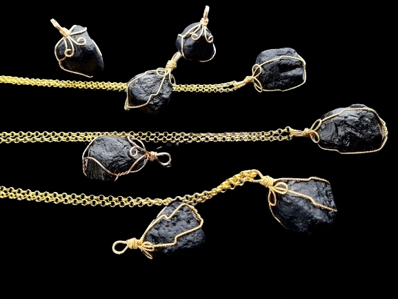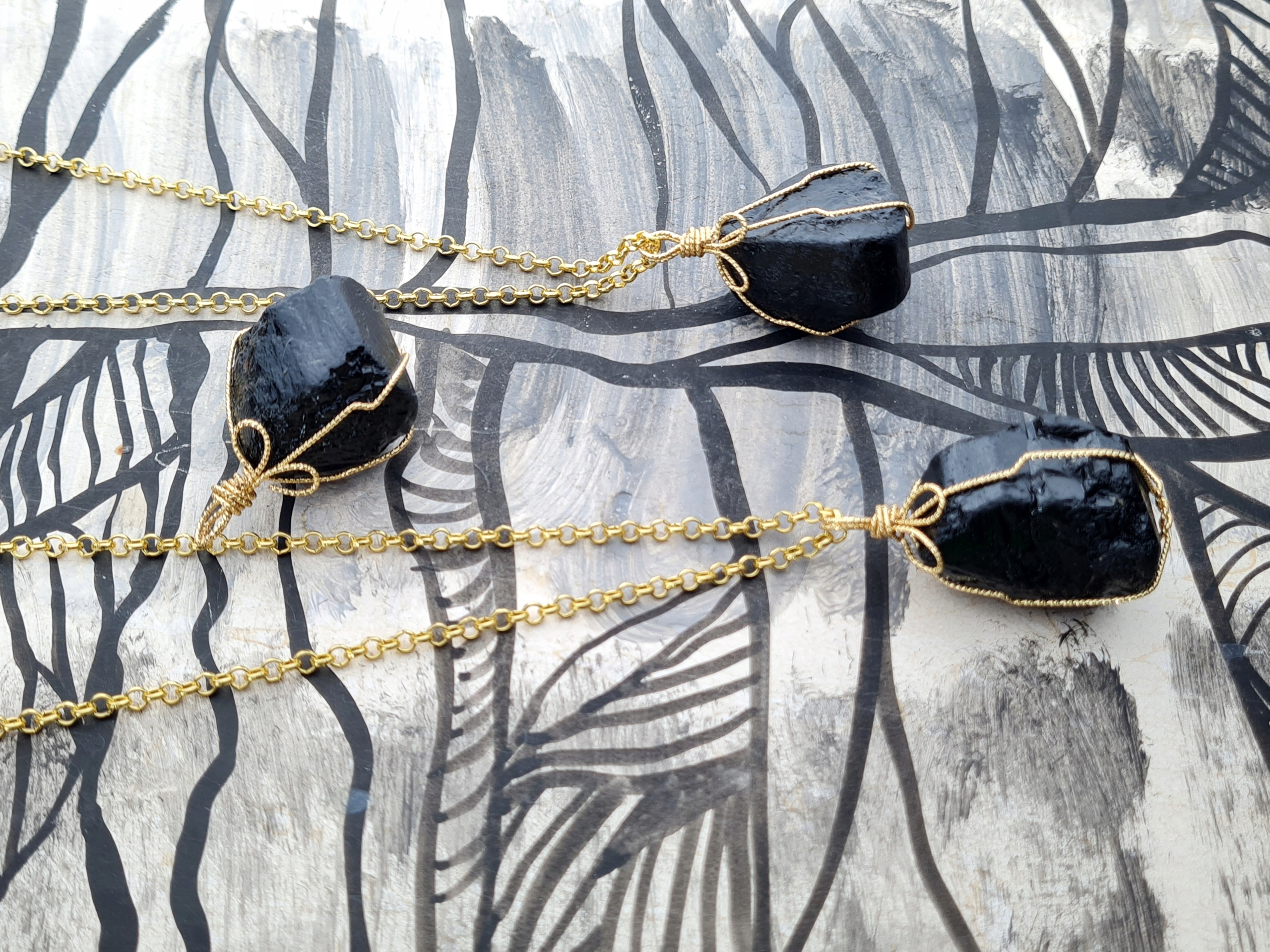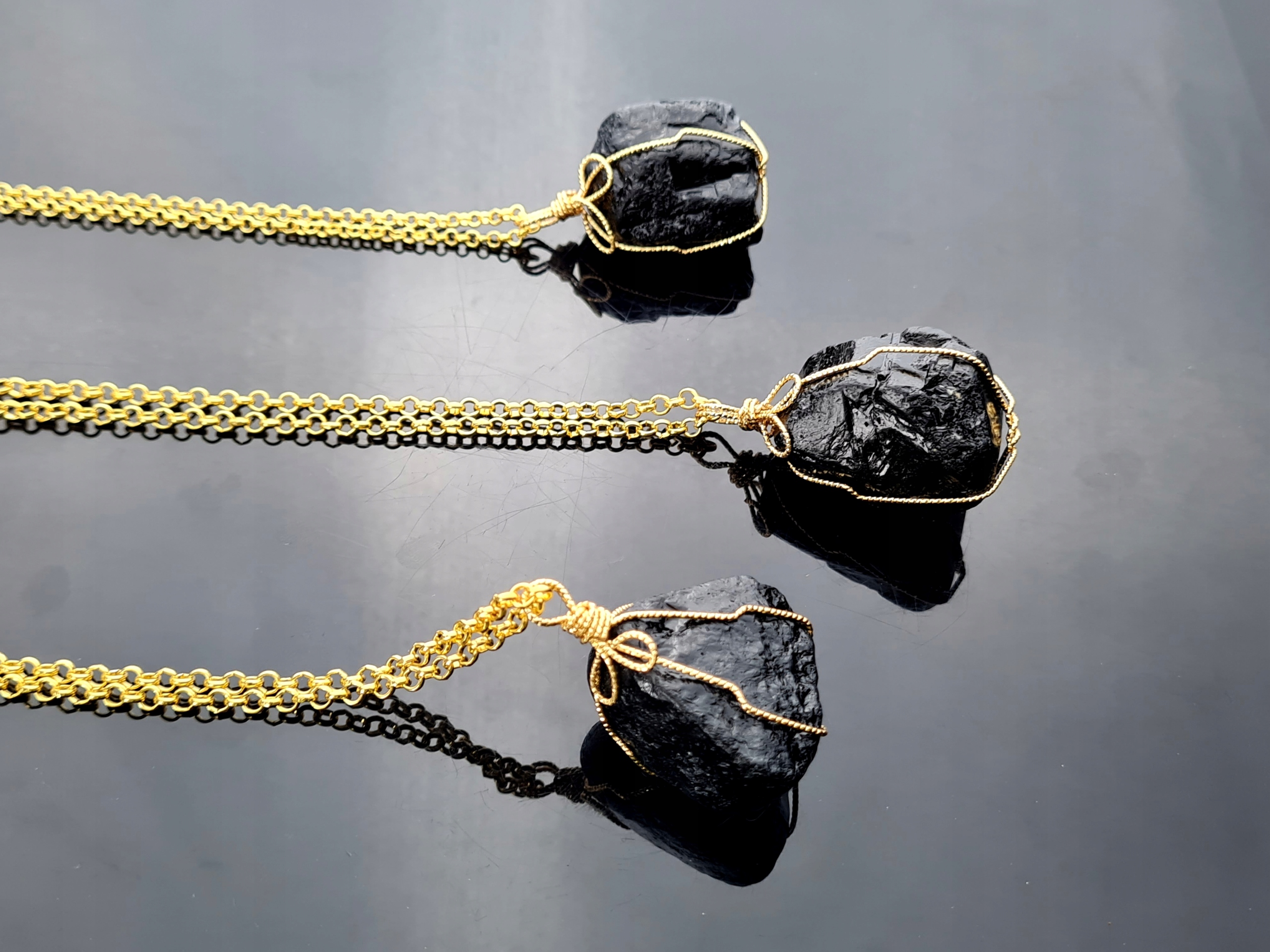 Великий турмалін у рамці ручної роботи з золотого декоративного дроту з відповідним ланцюгом, нерегулярними природними формами