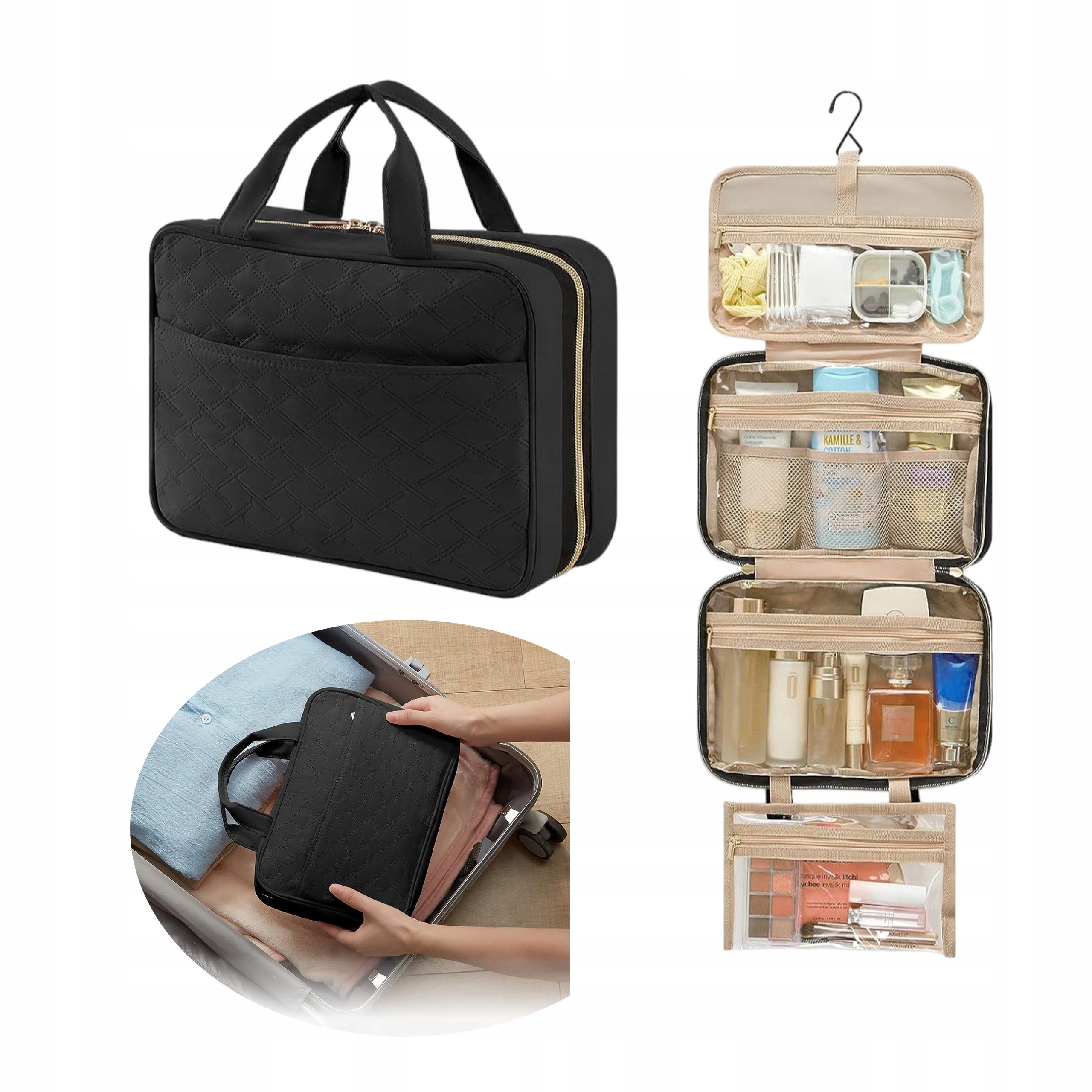 Усередині сумки ви знайдете 4 спеціальні відділеннядля вашої косметики - 2 більших для рідин, кремів і духів і 2 менших для аксесуарів і меншої косметики . Кожне відділення закривається на блискавку, що дозволяє зберігати продукти в порядку. Завдяки гачку ви можете повісити сумку та насолоджуватисяшвидшим доступом до косметики.