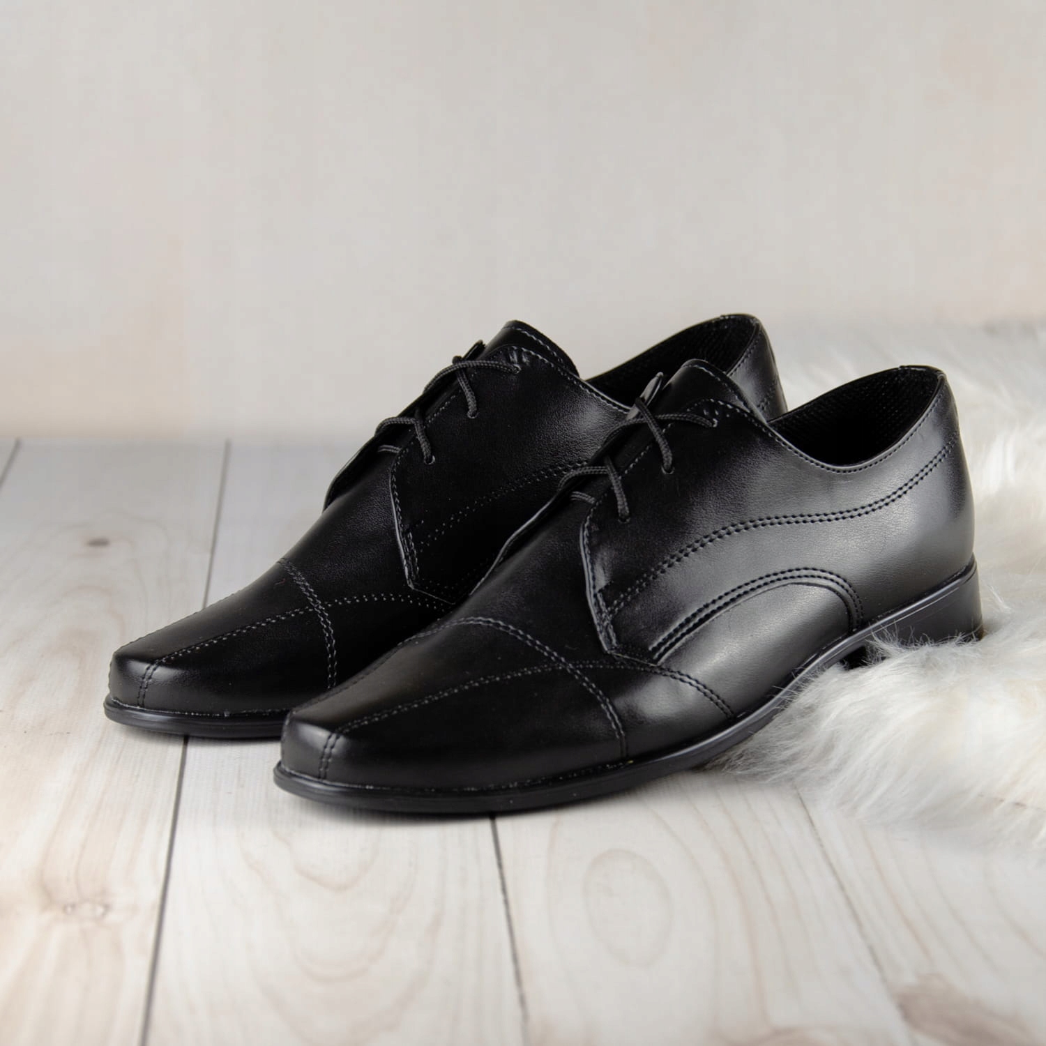 Класичне, чорне взуття для хлопчика. Добре -взуття, що робить їх дуже комфортними. Зовні взуття, виготовлене з м'якої екологічної шкіри, в той час як вставка натуральної шкіри. Універсальне взуття, яке буде відповідати як елегантному костюму причастя, так і класичній альбі чи комедії.