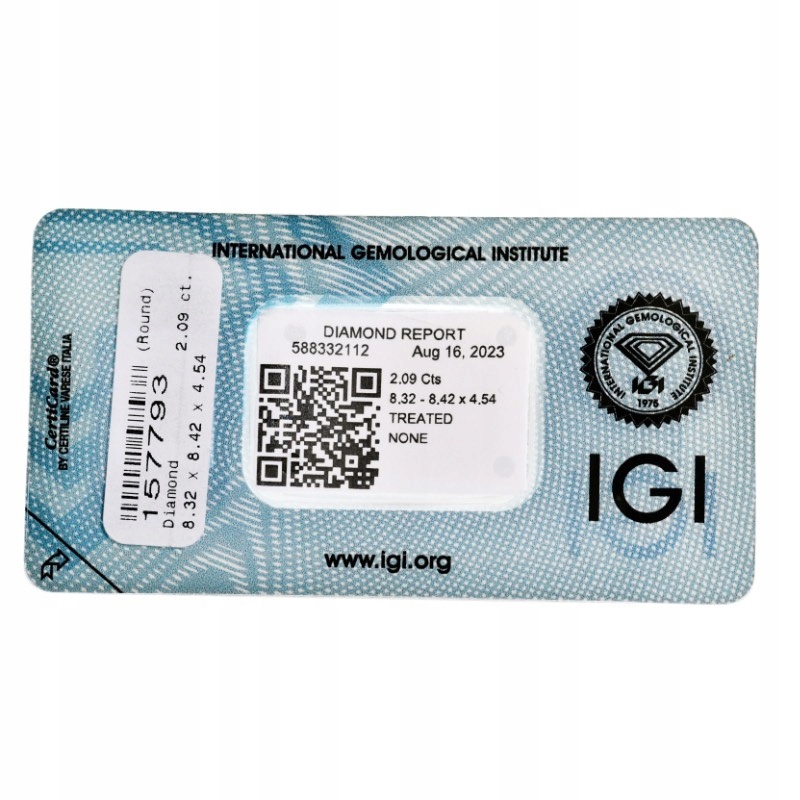 Діамант має міжнародний геммологічний сертифікат IGI в паперовому та електронному варіантах. Камінь закріплений за допомогою лазерної системи напису, що забезпечує максимальну безпеку. Номер свідоцтва: 588332112