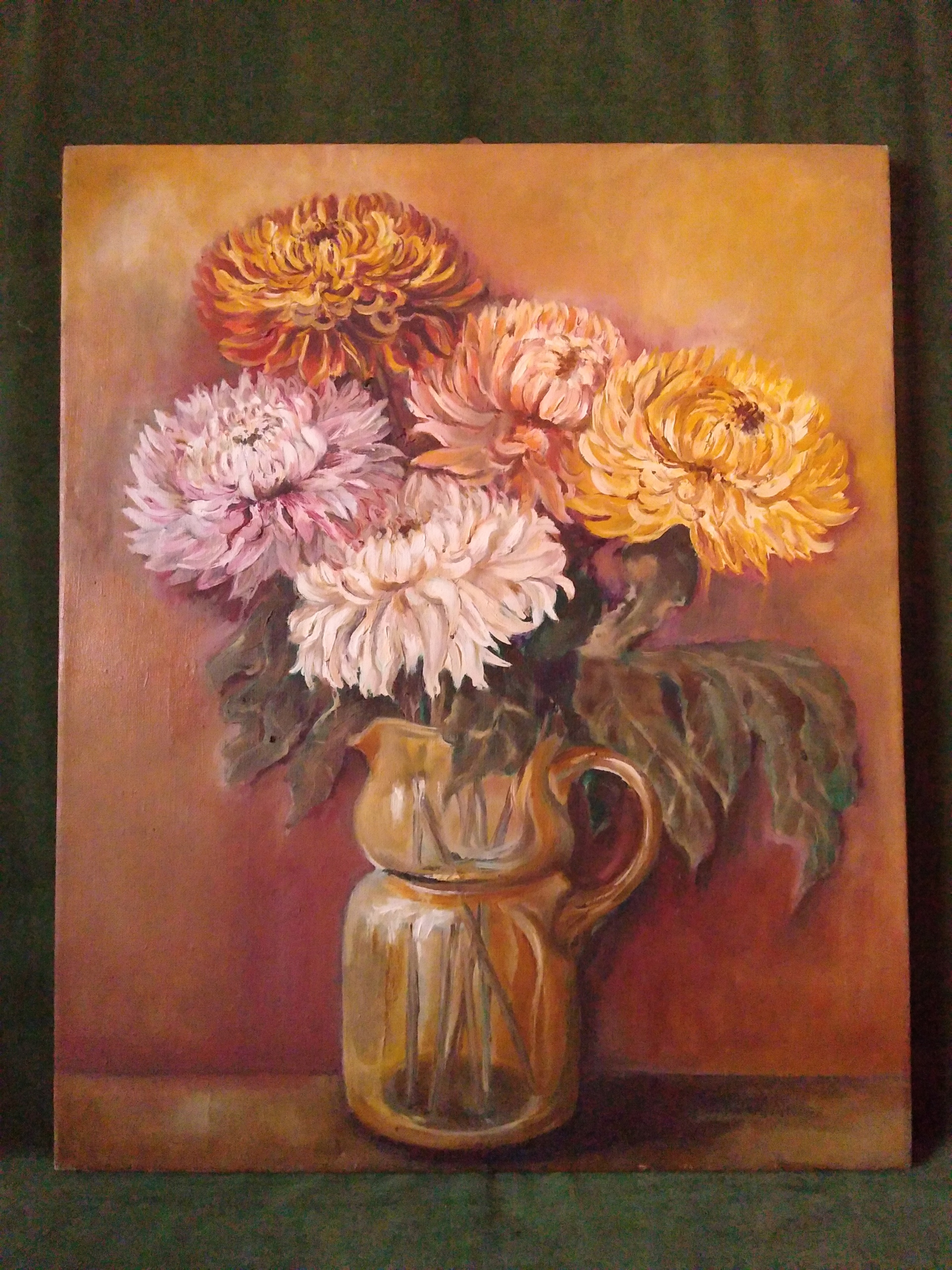 Chryzantemy - stary polski obraz olejny ręcznie malowany na płótnie