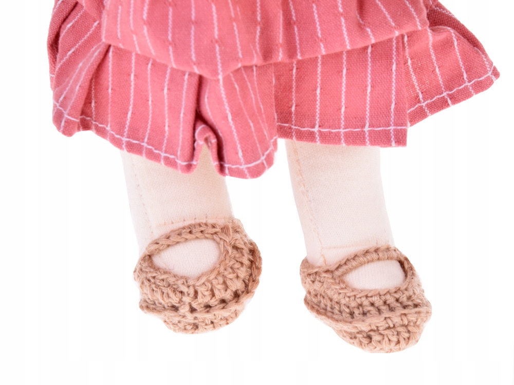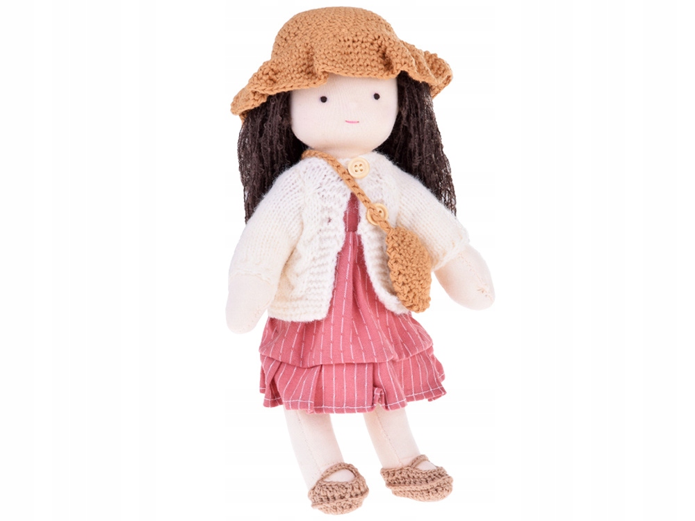 - Елегантна лялька з тканини з довгим каштановим волоссям точно підкорить ваше серце! чарівність. Він виготовлений з приємного на дотик матеріалу, який заохочує обіймати та обіймати. Одягнена в елегантну сукню з ніжними смужками, чарівний кремовий светр, що застібається на два ґудзики. Голову прикрашає вишукана шапочка, в цьому ж кольорі є сумка, в яку можна заховати дрібниці, ноги ляльки також прикрашають стильні в'язані туфлі. Ретельно оброблені деталі роблять ляльку справжньою маленькою елегантною дівчинкою.